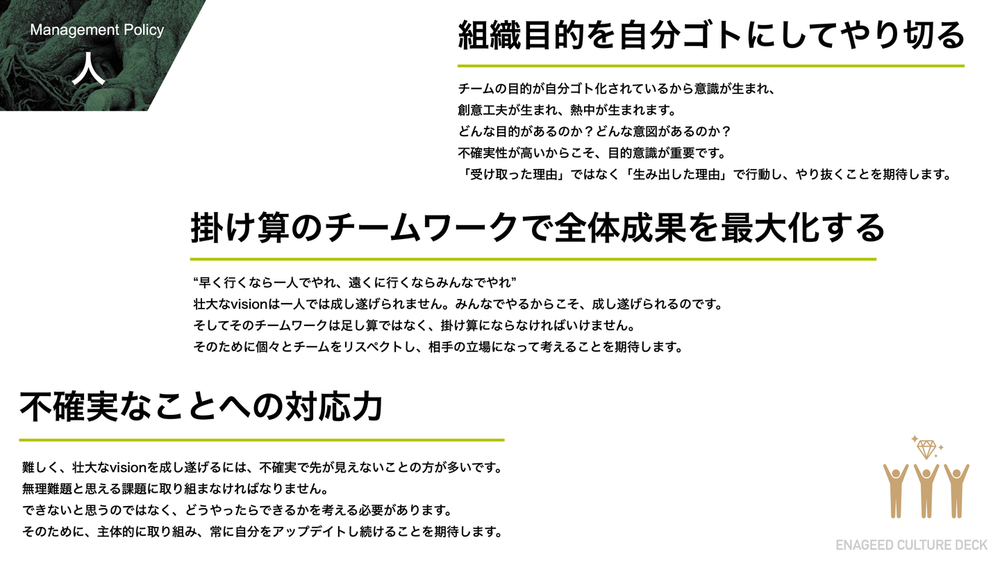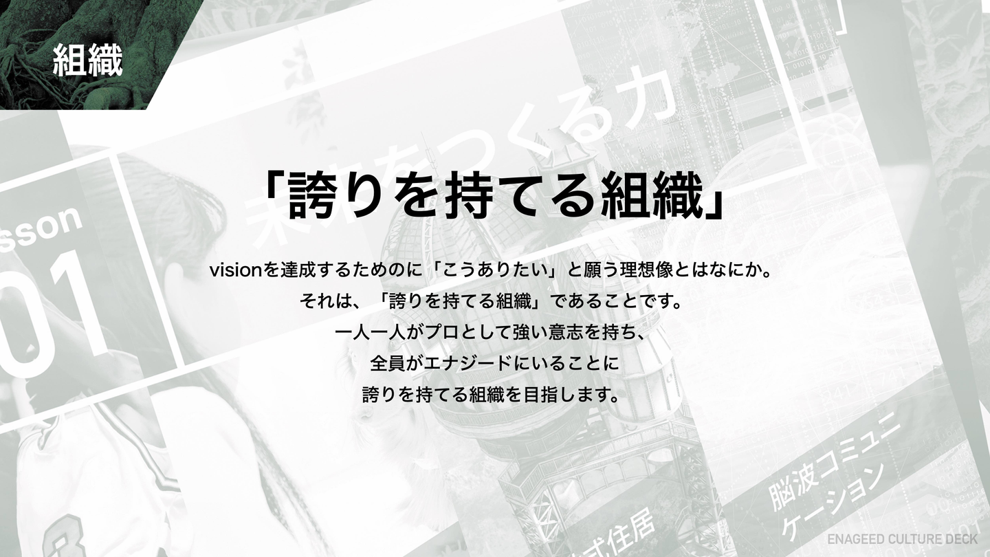 そこで今回、「エナジードはどんなカルチャーでvision達成を目指しているのか」について、共通言語とするべく作成した「カルチャーデック」を一部ご紹介いたします。