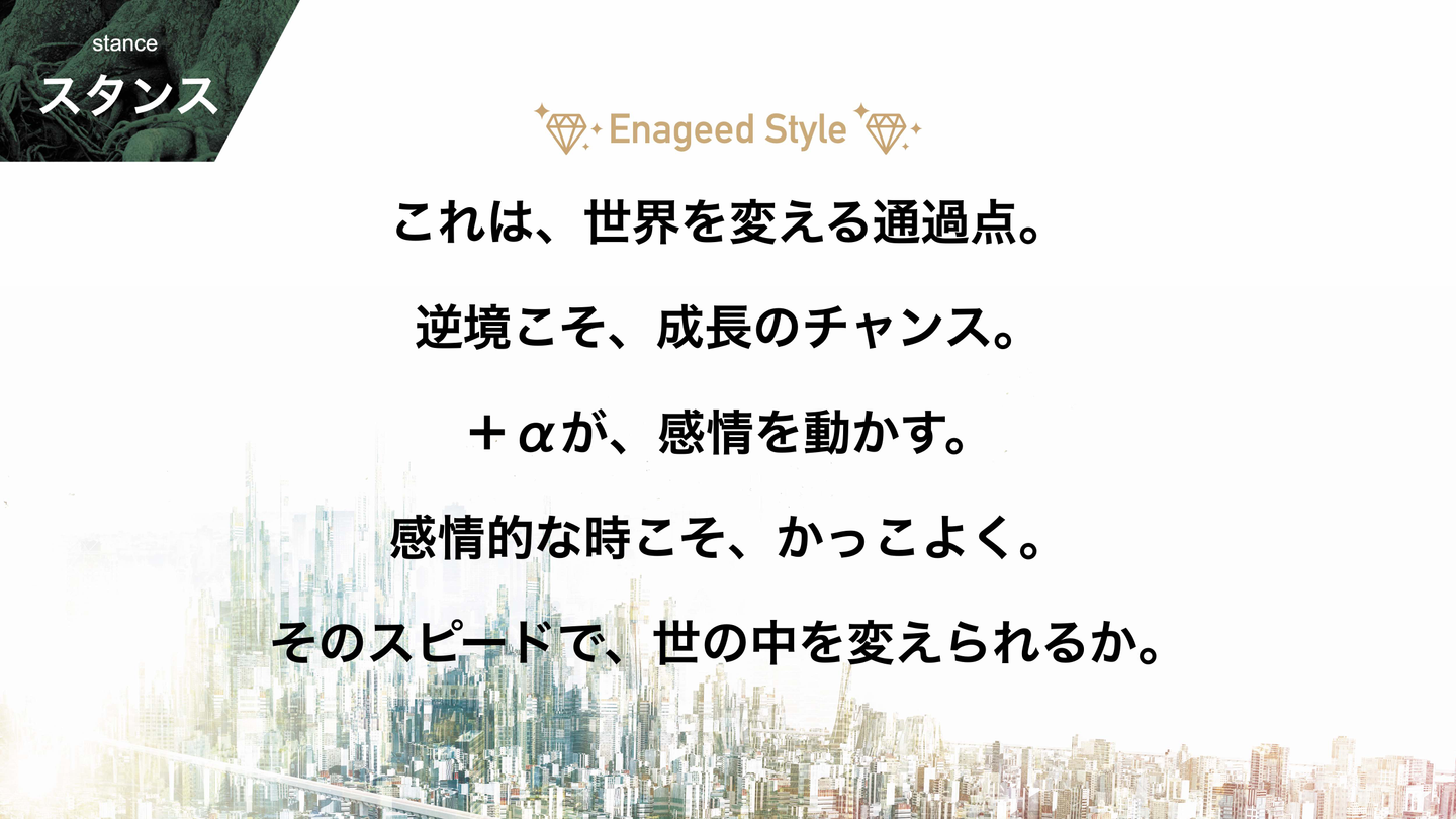 壮大なvisionを達成するために、エナジード社員が心がけているスタンスを「Enageed Style」としてまとめました。エナジードの雰囲気が伝わるかなと思います!