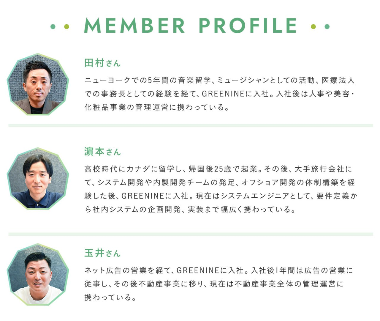 さまざまな経験から培われたお三方のエピソードは、これからのキャリアを考える皆さんにとっても、大いに参考になることでしょう。GREENINEとその未来を語るこの対談を、どうぞお楽しみください!