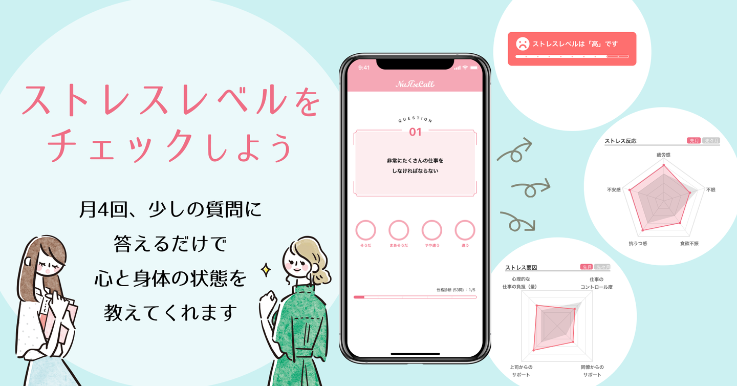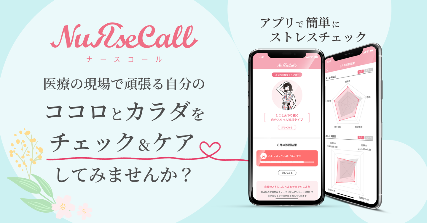 NuRseCall(ナースコール)は、看護師が自分自身のストレス状態を把握し、心と体のセルフケアをサポートするアプリです。