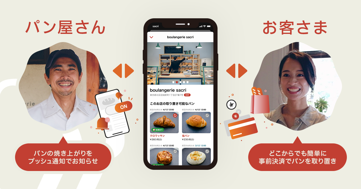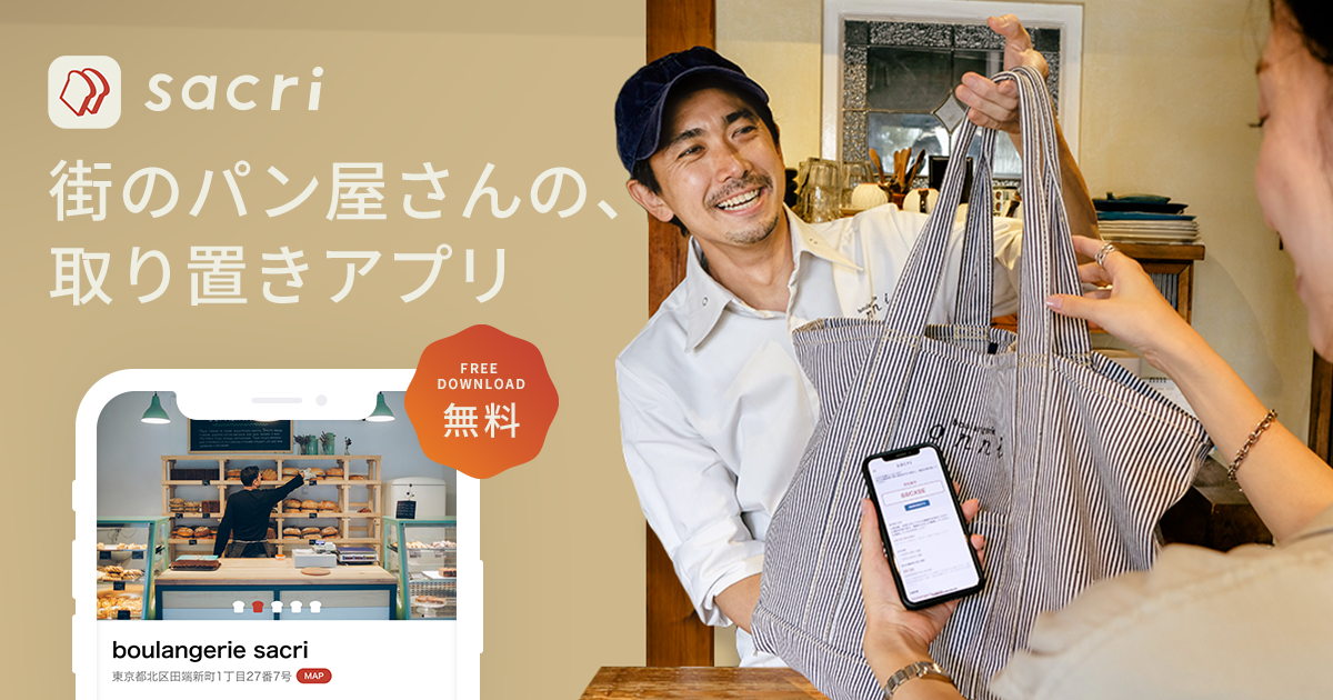 sacri(サクリ)は、街のパン屋さんのパンをお客さまがどこからでも簡単に事前決済と取り置きができるアプリです。