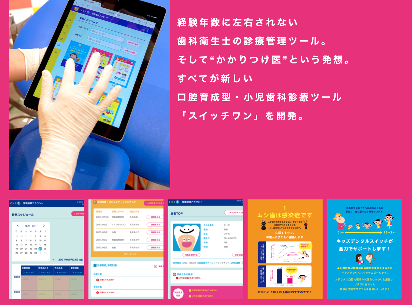 「歯列予防」と「ムシ歯予防」小児歯科の、これからの新常識。人生100年時代!ずっと使える、ちゃんと噛める歯と口腔機能を子どもたちに。はじめまして!「デンタル・スイッチ」です。 経験年数に左右されない歯科衛生士の診療管理ツール。そして"かかりつけ医"という発想。すべてが新しい口腔育成型・小児歯科診療ツール「スイッチワン」を開発。 ...