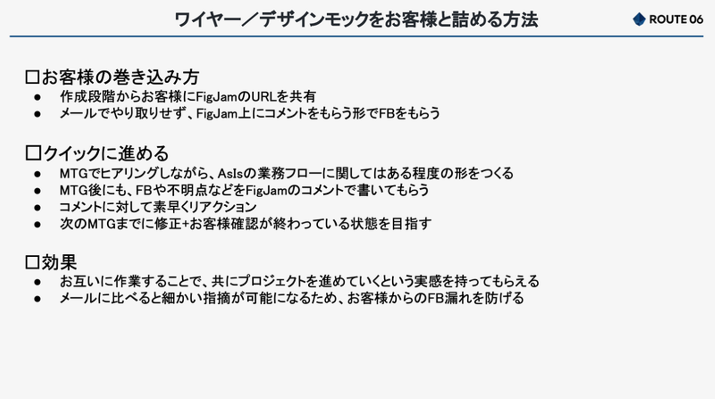 さらに、クイックに進めるためにミーティング後にFigJam上にフィードバックや不明点を書いてもらったり、次のミーティングまでに修正と確認が終わっているように素早く対応したりしています。
