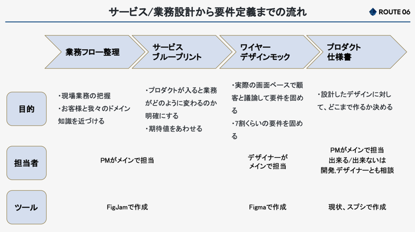 プロダクトマネージャーが業務フロー整理やサービスブループリントを活用して仕様を整理し、それをベースにデザイナーがワイヤー、デザインモックを作成します。最終的には仕様、デザインを合わせたプロダクト仕様書に落とし込みます。