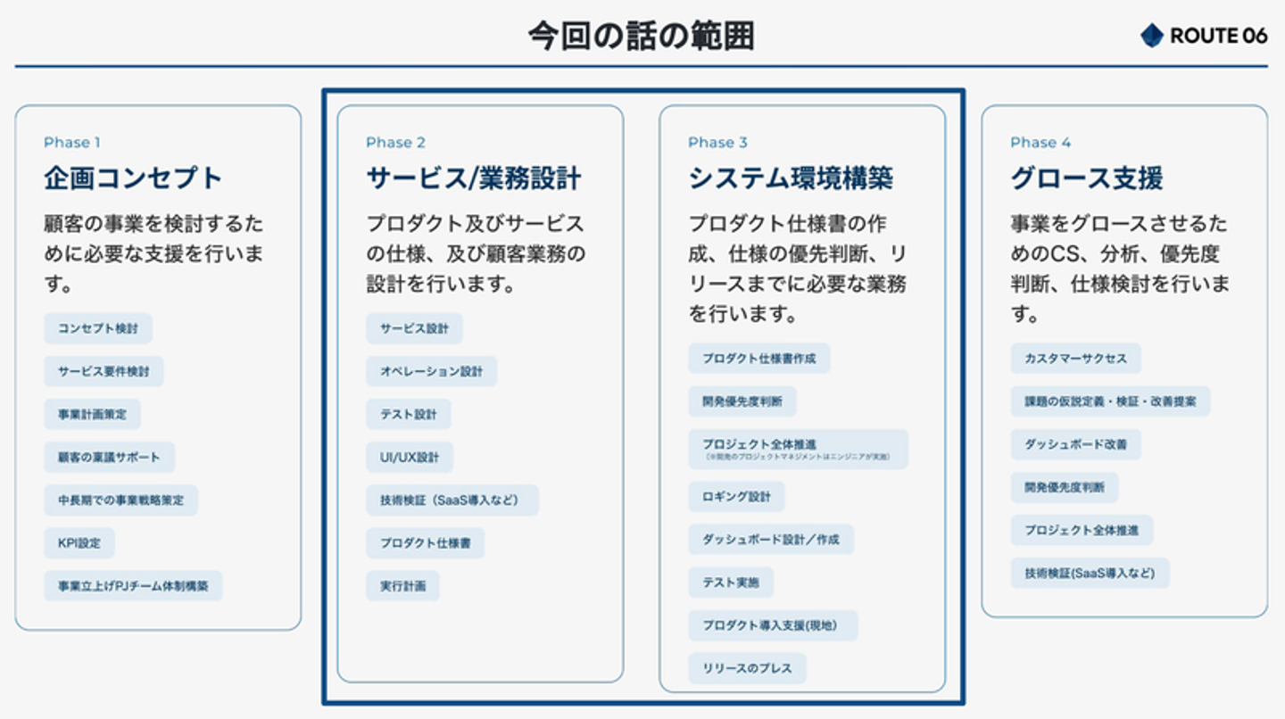 弊社は「プロフェッショナルサービス」という事業支援を行なっているのですが、4段階あるフェーズのうち、フェーズ2のサービス/業務設計と、フェーズ3のシステム環境構築についてお伝えしますね。