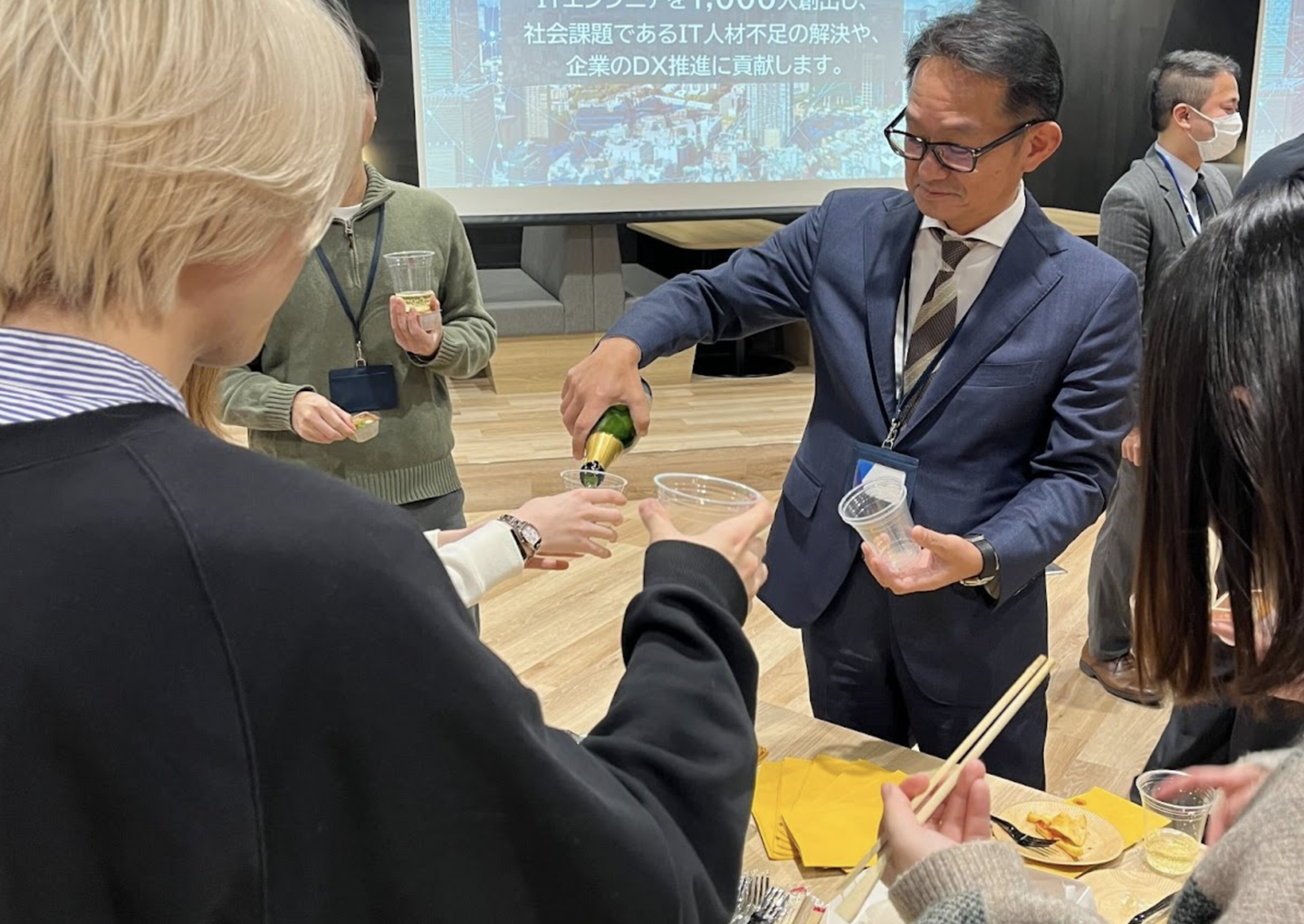 会長や社長、そして研修講師など多くの社員が、テラテクに興味を持ってくださった参加者にお酒をついだり、積極的にコミュニケーションをとって“おもてなし”させていただきました。ピザやおしゃれなフィンガーフード、デザートまで揃えたお料理も大変好評で、話も弾む様子が伺えました。