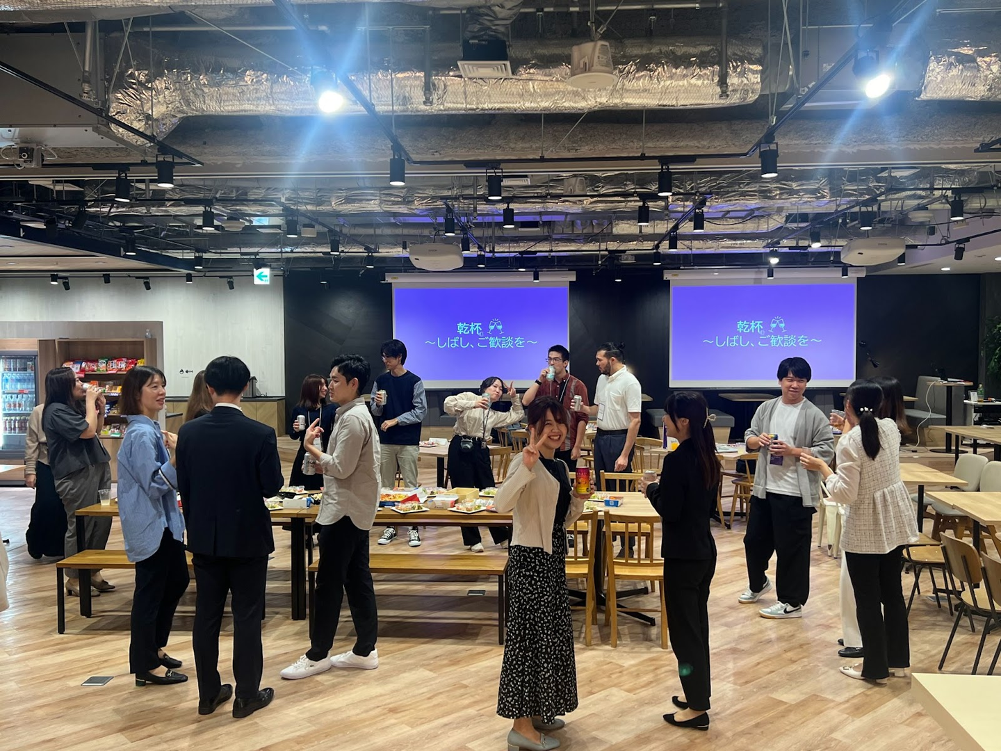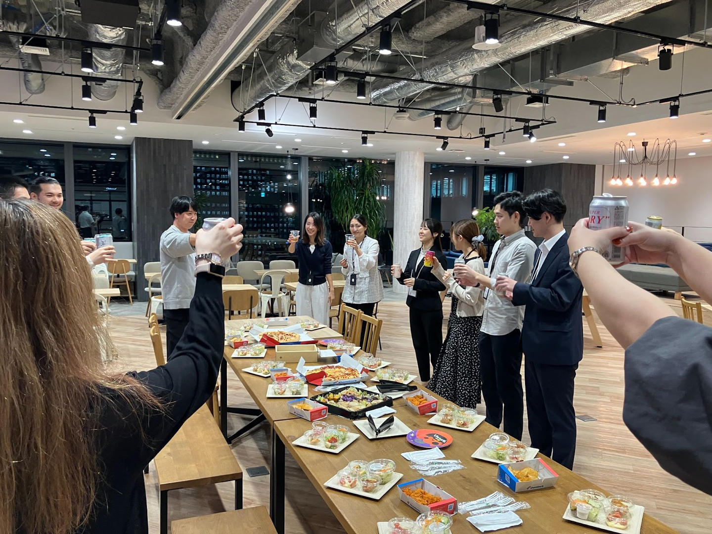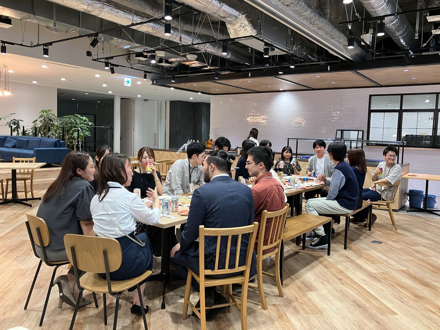 ゲームとデモの後は待ちに待った懇親タイムは、講師陣も多数合流してゲストたちのおもてなしの準備は万端です。乾いた喉に、まずは研修講師リーダーの佐藤彰太さんの乾杯でスタートを切りました。ピザやからあげ、ポテトといった軽食とともに進んだ歓談の時間は、予定時間が過ぎても席を立つ人が1人もなく、講師や先輩社員と尽きない話に花が咲き続けていました。この時間はアンケートでも満足度が非常に高く、ゲストはもちろん、講師や先輩社員にとっても楽しい歓談の時間になったようでした。