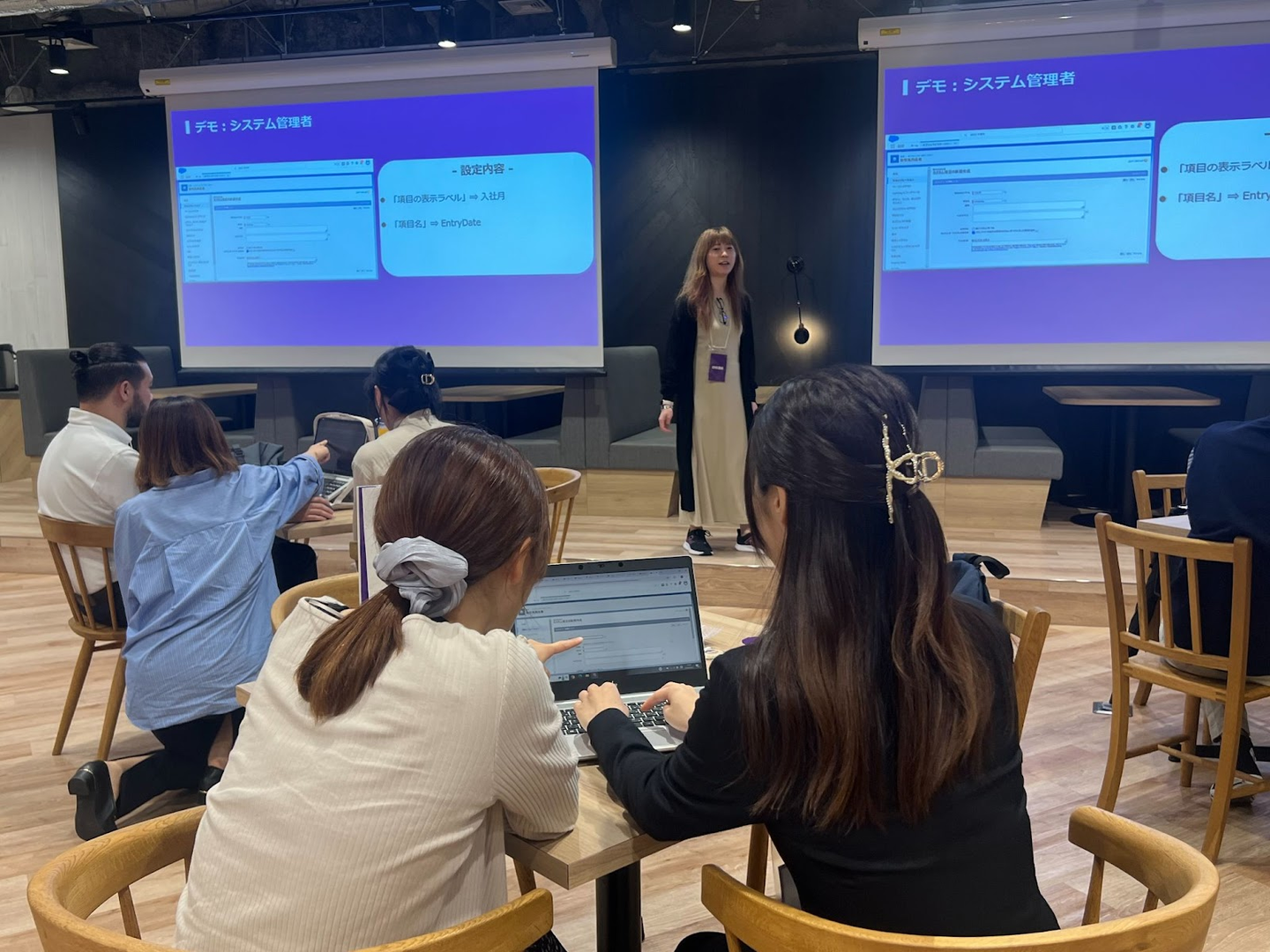 クイズの後はメインコンテンツであるSaleforceのデモ体験。講師の高津さんがガイドをしながら、簡単な登録や設定をテーブルごとに行っていただきました。ゲストを招待した社員も横でサポートしながら、ゲストが中心となって操作を進めていきましたが、楽しみながらスムーズにSalesforceを体験いただくことができた様子でした。