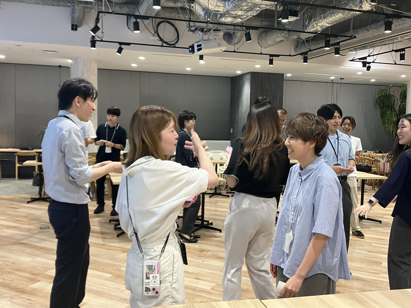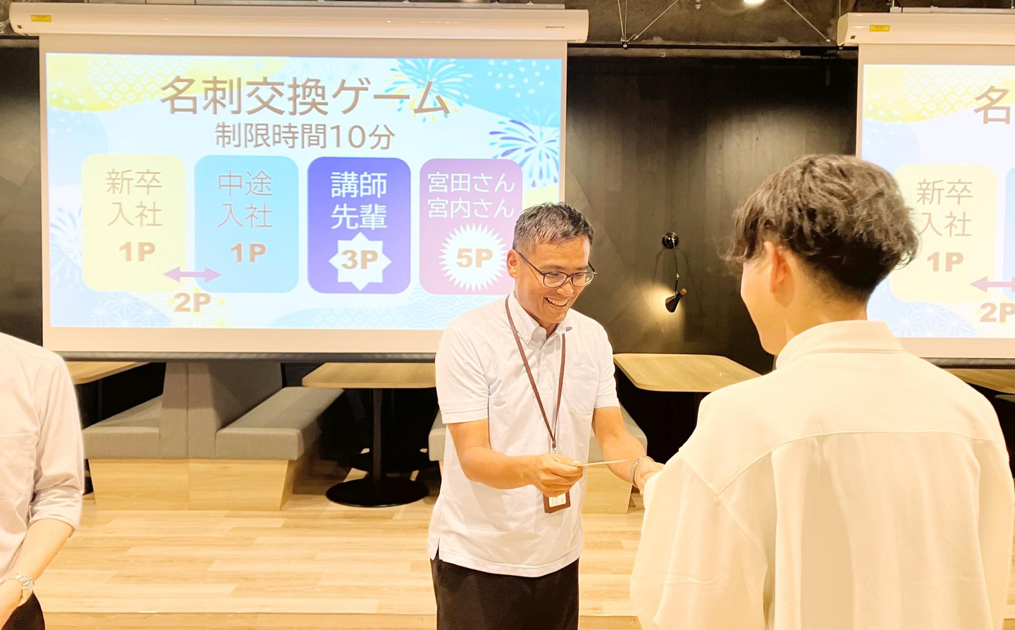 アイスブレイクの自己紹介で、入社した社員、先輩社員、講師、役員が一斉に名刺交換