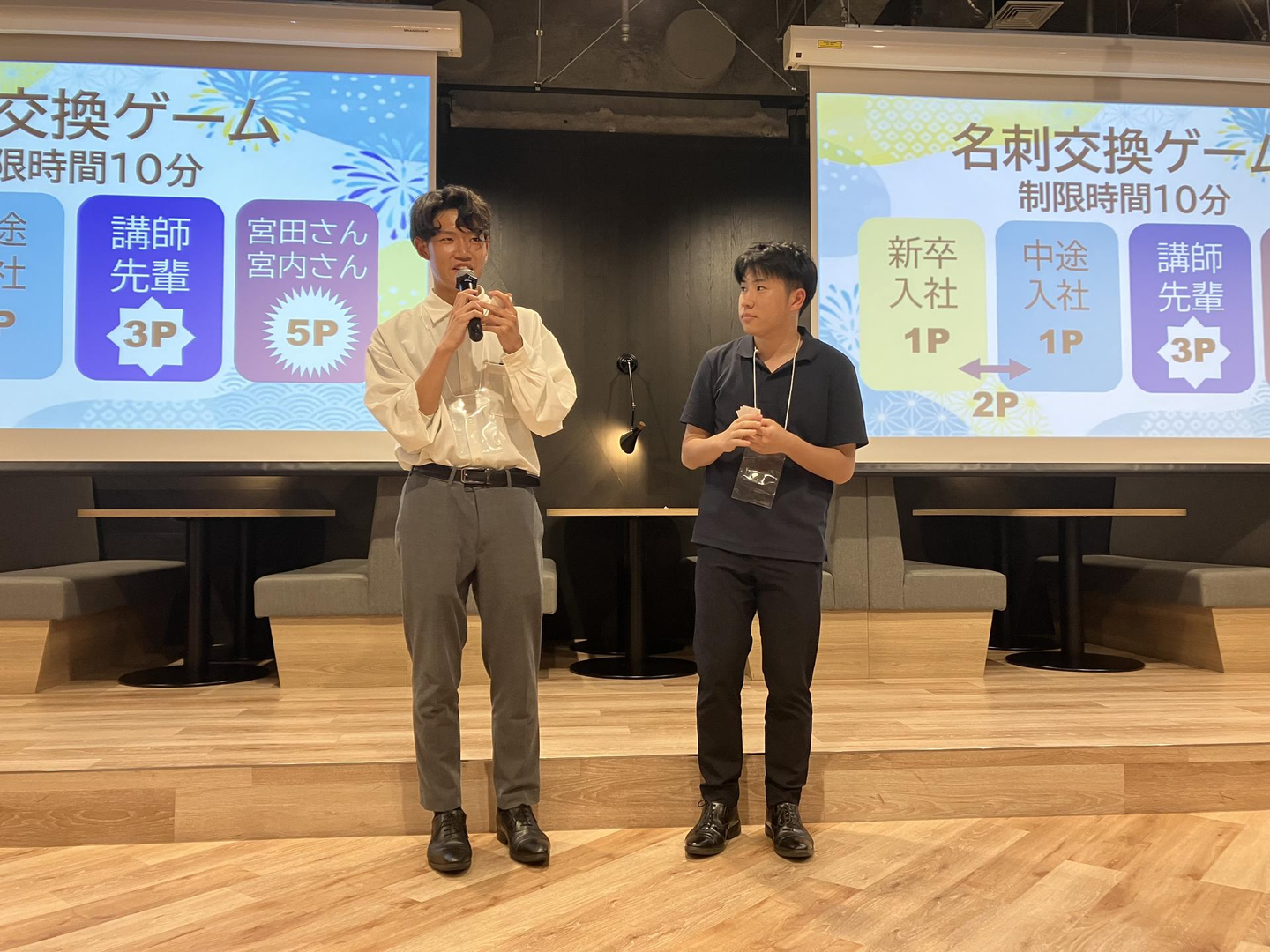 新卒を含めて35名の新たなメンバーを対象とした今回のウェルカムパーティでは、まず最初に自己紹介を兼ねてアイスブレイク「名刺交換ゲーム」を実施。先輩や講師と名刺交換したら3ポイント、役員と名刺交換したら5ポイントと点数を設定し、最終的に交換できた名刺のポイント数で競い合いました。1度で高点数が獲得できる役員には列をなして交換待ちも。普段なかなか話せない役員ともゲームをきっかけに挨拶ができ、入社した皆さんにも笑顔が溢れていました。
