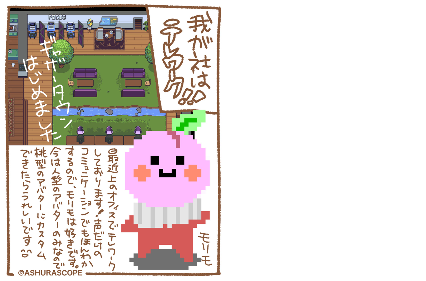 画面に絵があることによってコミュニケーションが柔らかくなるというか、まろやかになる気がしていて良い感じがしています。まだまだデフォルトの状態なので、これから意見を集めてもっとアシュラスコープらしいオフィスにカスタムしていきたいと思っております!