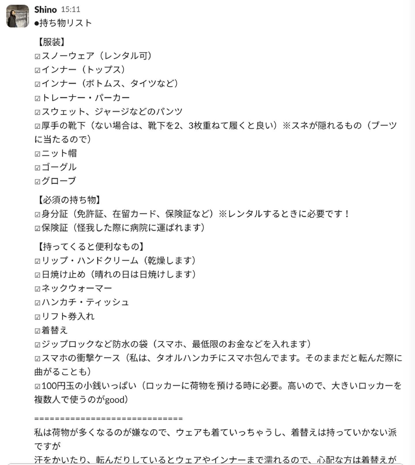 雪山は天候が変わりやすいので、メンバーが困らないように、社内チャットツール(Slack)で細かく確認します。