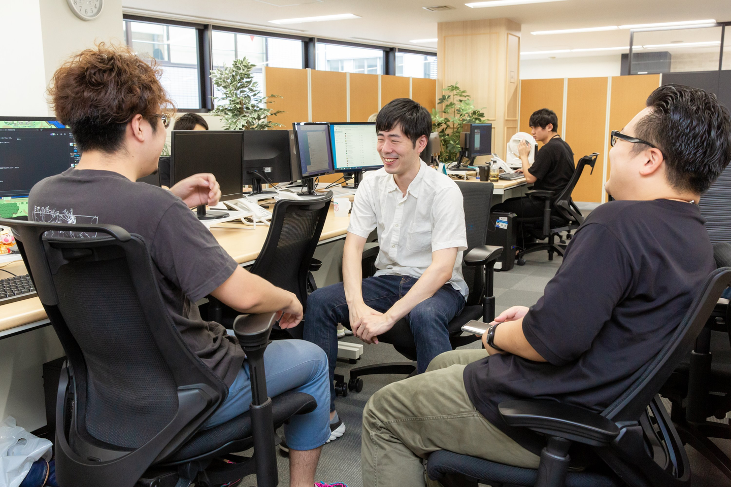 ▲プログラマー達とすり合わせ中のプランナーMさん。 プランナーMさんがすり合わせを行っているときはいつも笑い声が聞こえてきます。関口 しっかりと自分の考えを伝えるプランナーと、それをデータによって根拠を深める管理部の力でアプリのスタートは成り立っているのですね!