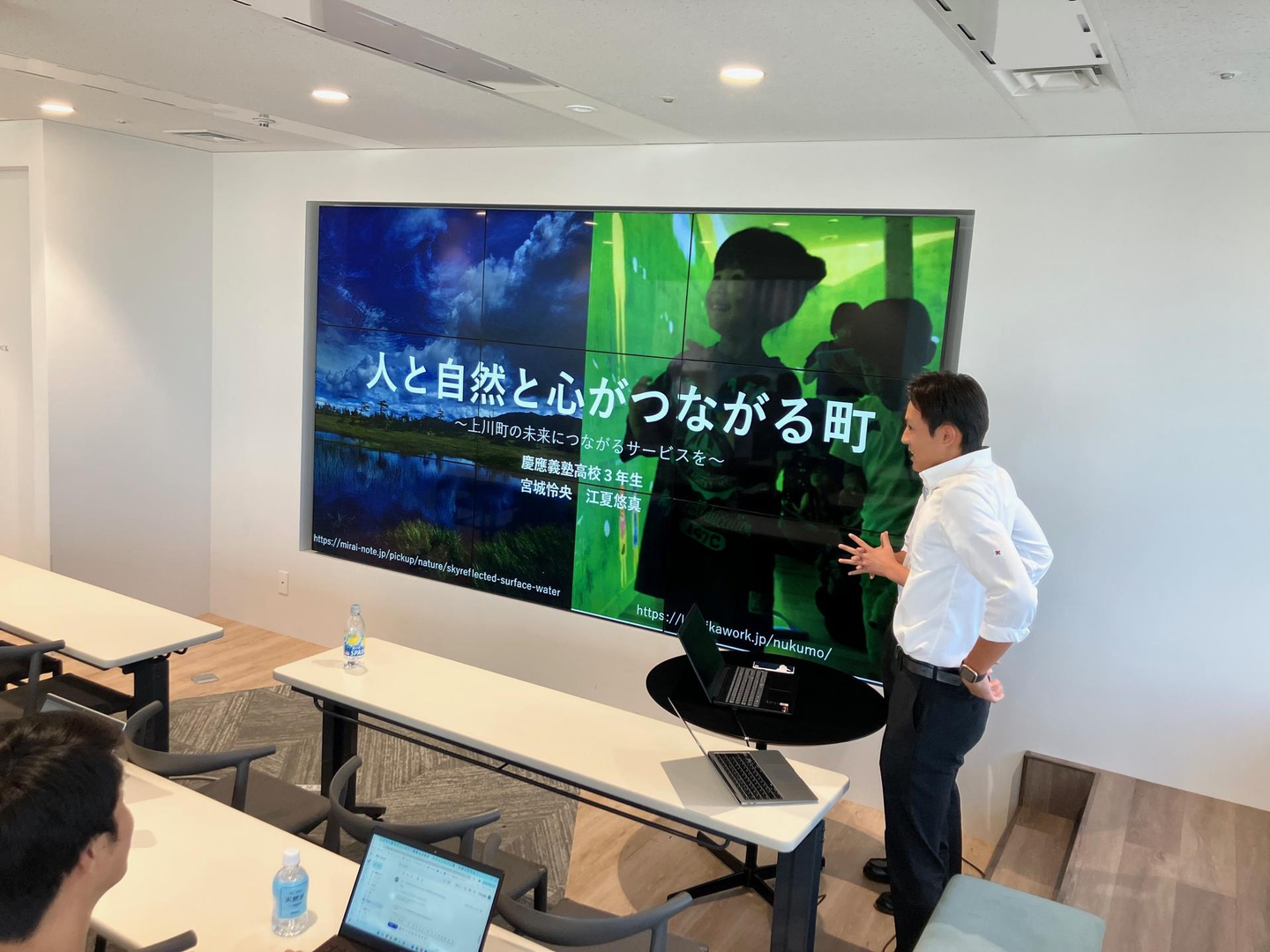与えられた課題に対する宮城さんの回答は、上川町の豊かな大自然を使ったアクティビティの提案となりました。上川町の広大な面積をいかした「かくれんぼ」を顔認証でやってみよう、パルクールのような若者が熱狂していくものにしていけたら良いなという取り組みです。