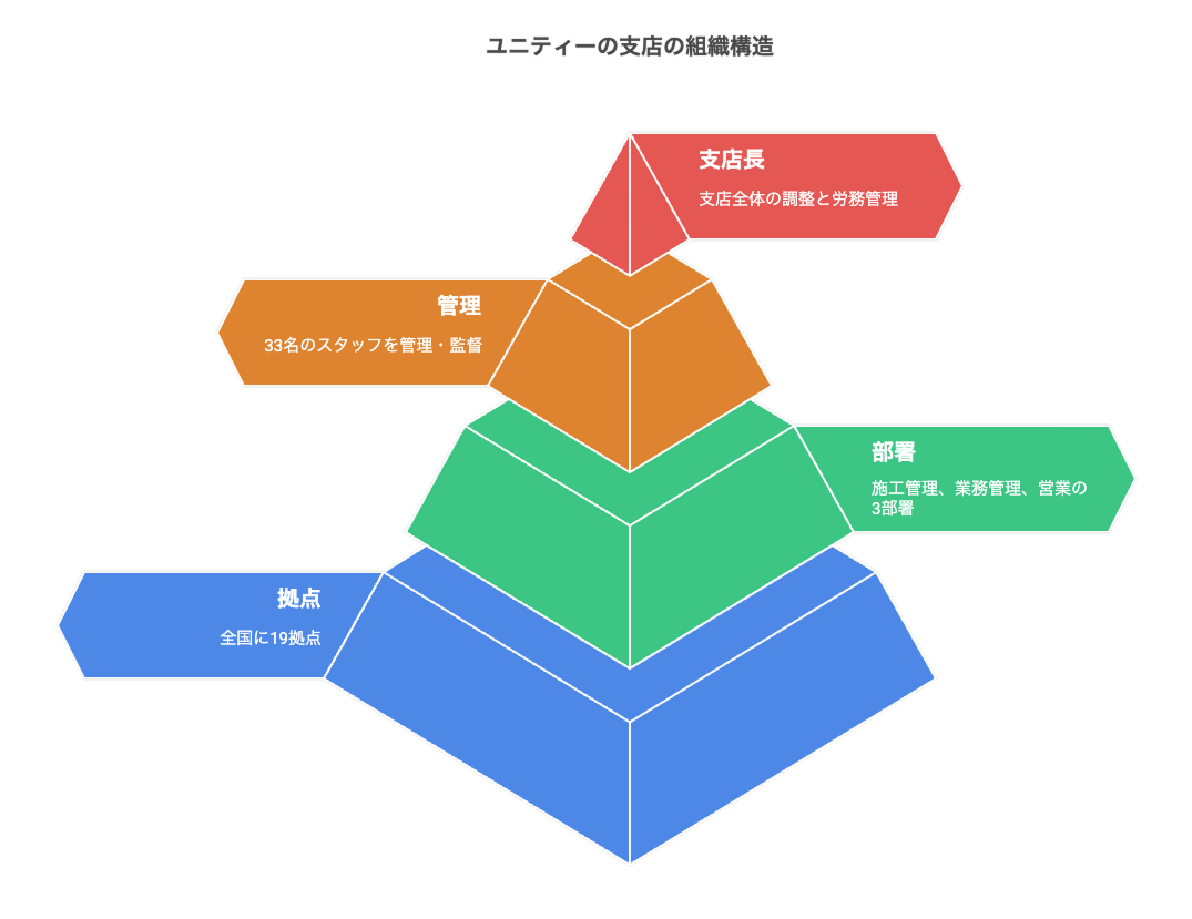ユニティーは現在、全国で17拠点と、専門的な仕事を行う2拠点の、計19拠点あり、各拠点は施工管理部、業務管理部、営業部の3部署で構成されています。私は上野支店で、この3部署に在籍する33名を管理、監督しています。