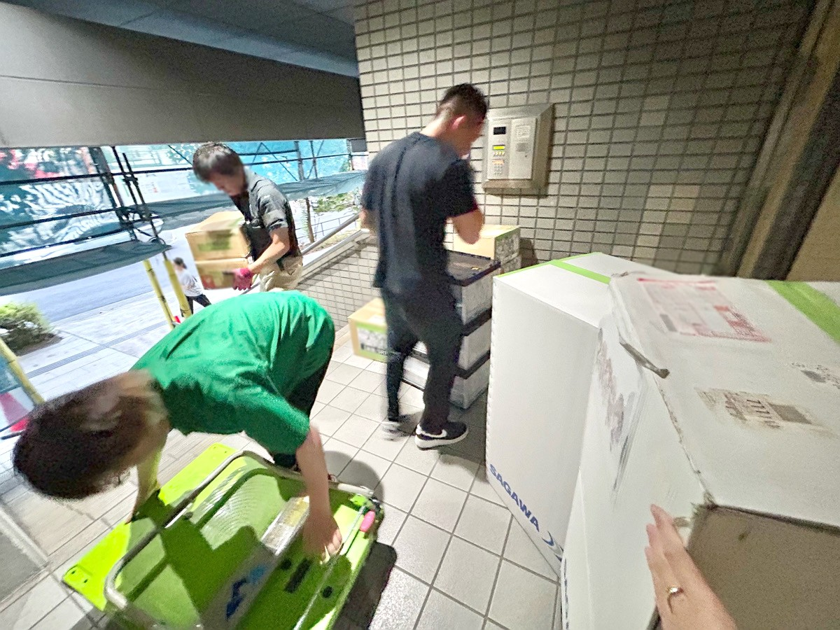 準備の最終段階は、荷物の積み込みです。エレベーターを何度も往復しながら、トラックへ運び込みます。