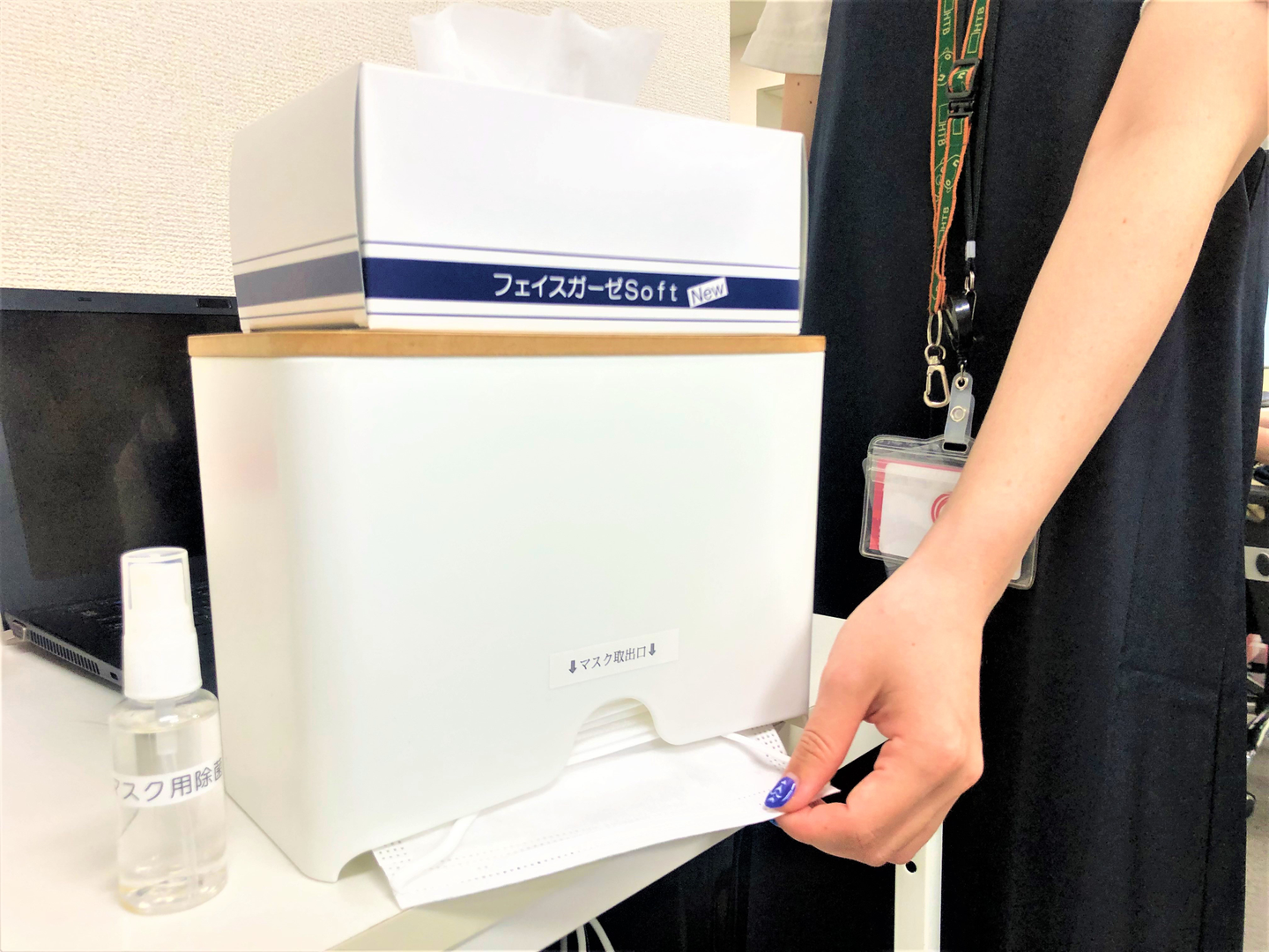 従業員全員が、マスクを着用しています。社内には「マスク」「マスク用除菌スプレー」「マスクガーゼ」を常備しており、誰でも自由に使用可能です。