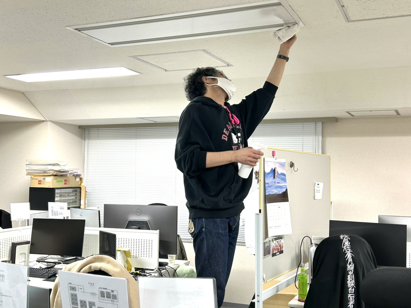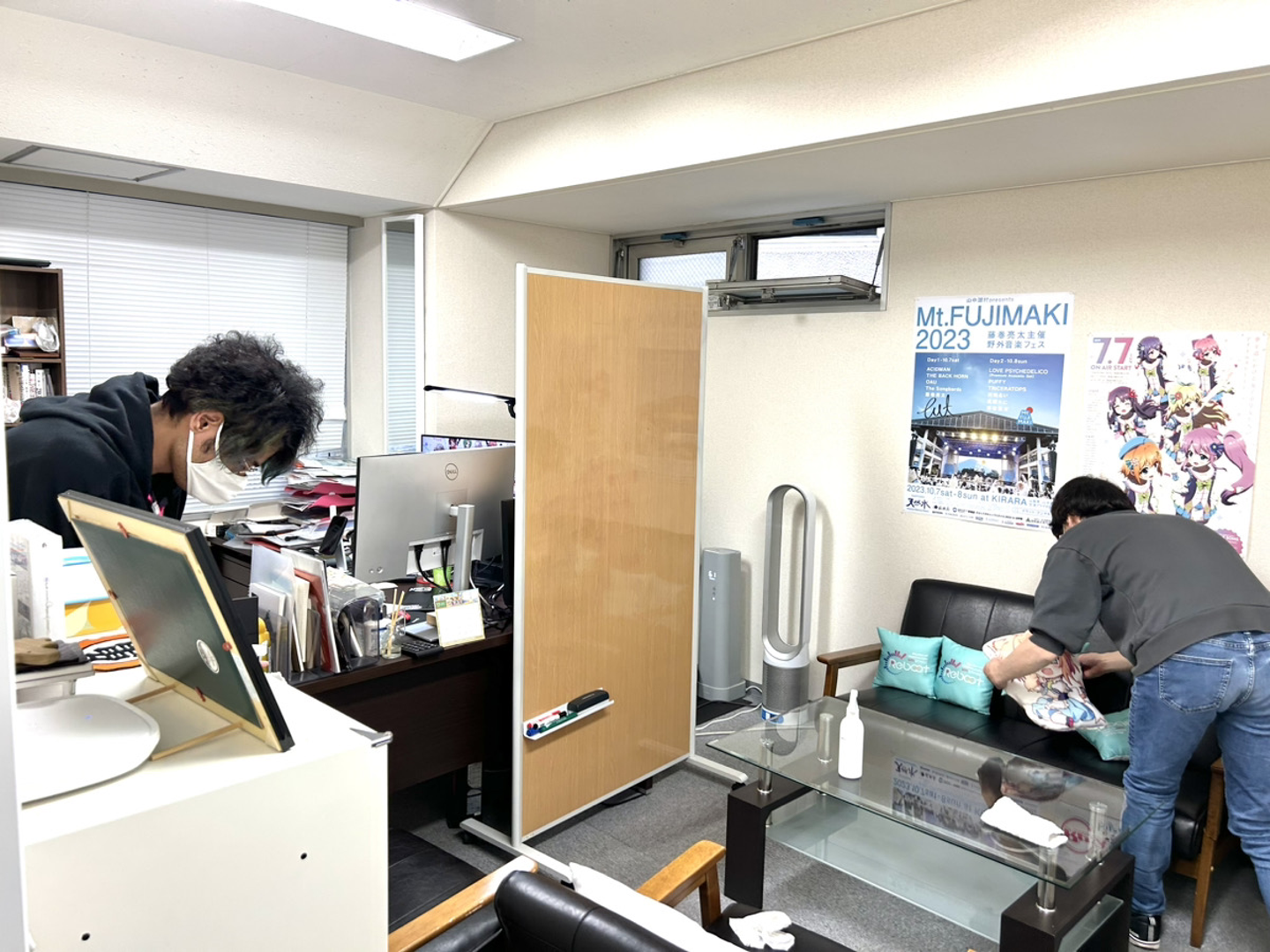 メインオフィスだけでなくサテライトオフィスの執務室やスタジオも掃除をおこなうため、掃除範囲はとても広いですが、全員で手分けしておこなっているということもあり、1時間半ほどで終わります。