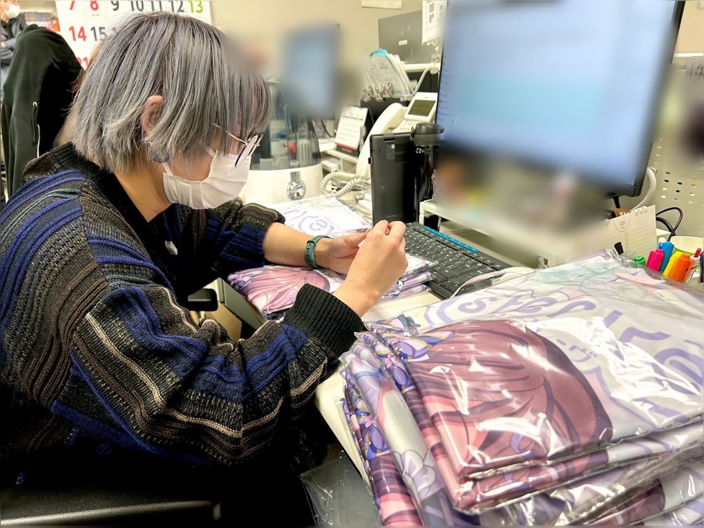 検品作業は1~3名でおこなっていて、デザインが掠れていないか、異物が混入していないか、糸のほつれがないか等、お客さんの手元に届くグッズに不良品がないか、しっかりと確認していきます。