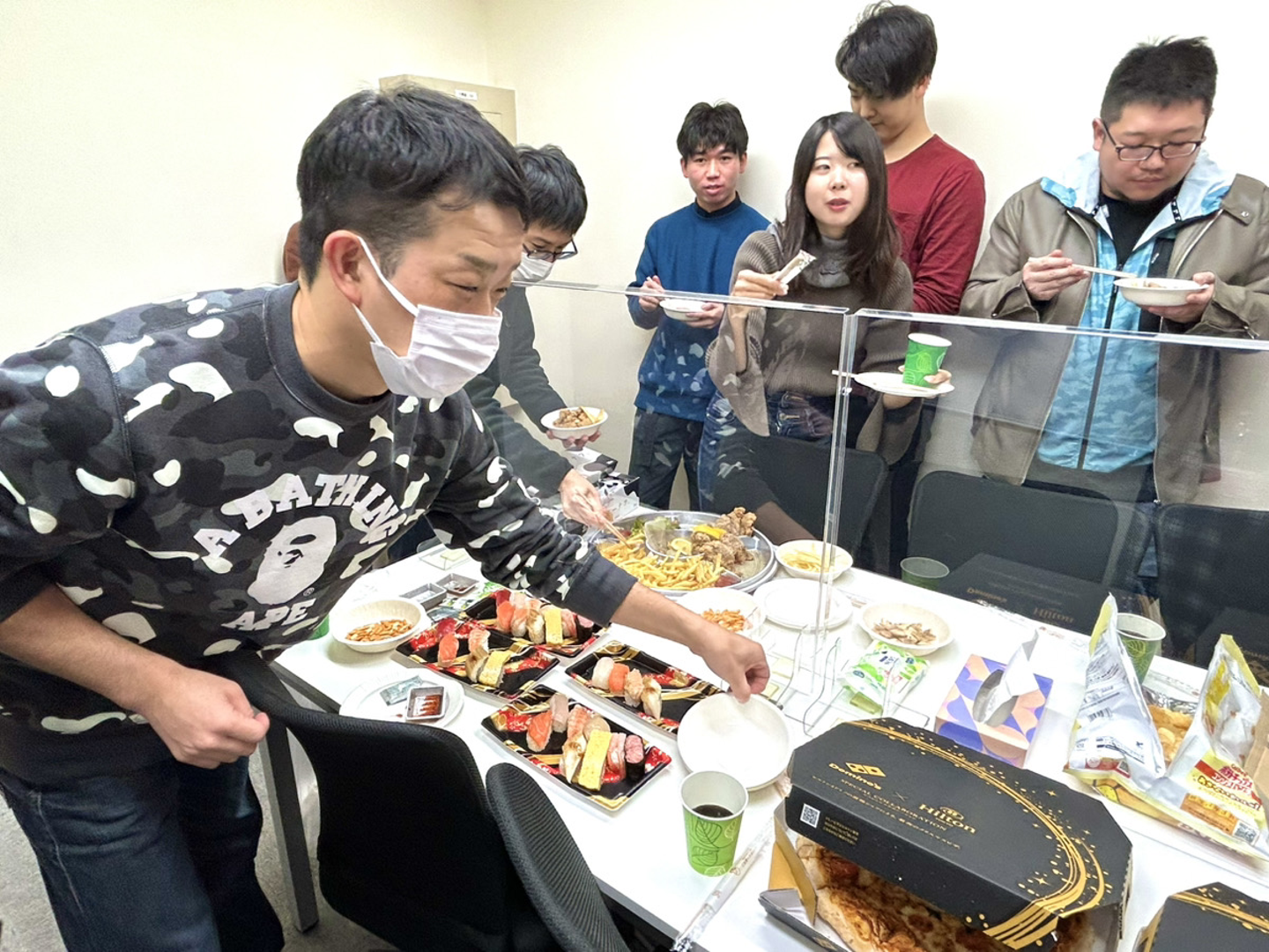 今回の食事は、ピザ・お寿司・おにぎり、そして某有名居酒屋の店長さんに特別に用意していただいたオードブルです。こちらの要望を快く受けてくださり、揚げ物たくさんの茶色いオードブルになりました(笑)代表の太田も、ご満悦です!