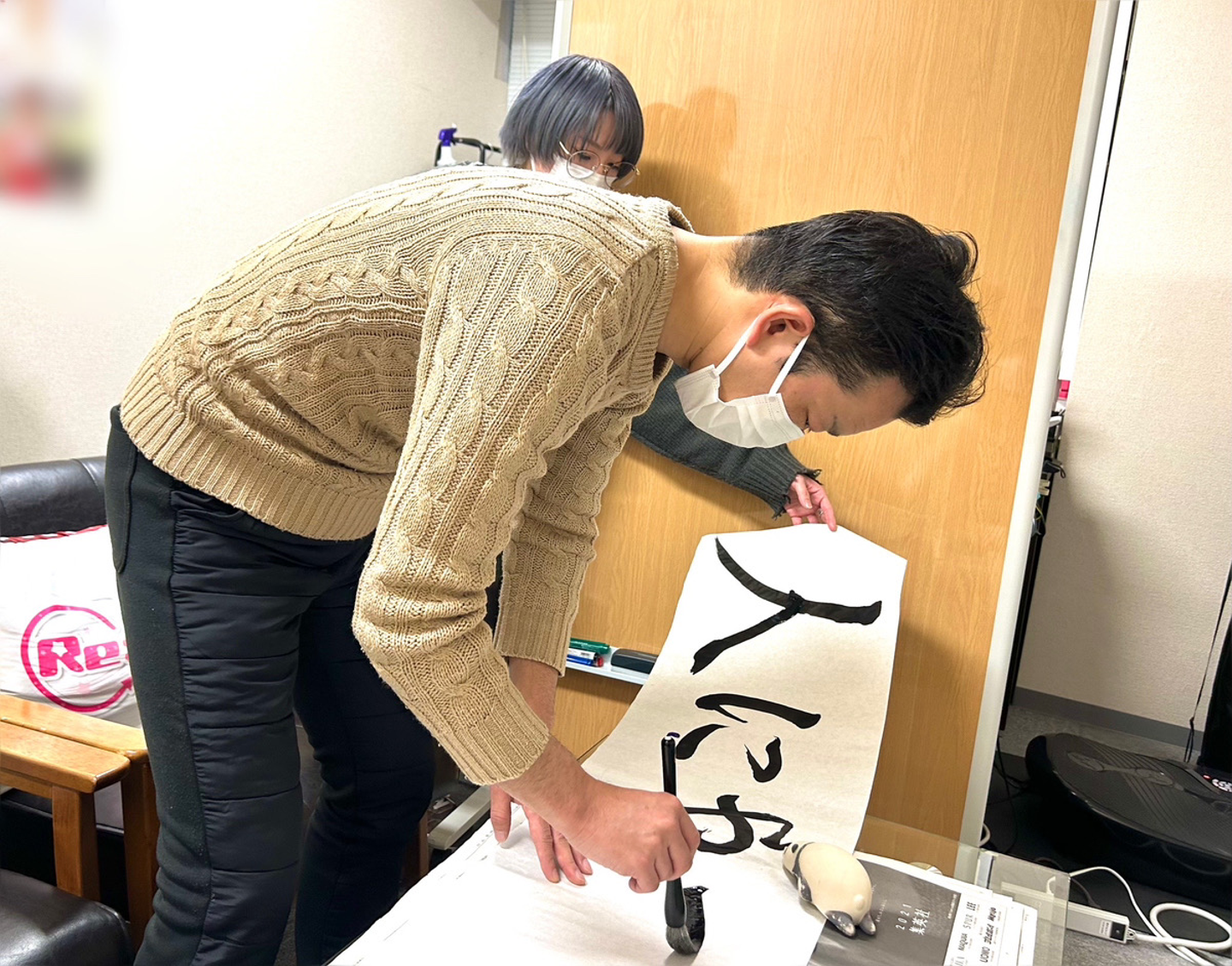 そして年始のもうひとつの恒例行事、こちらは書初めの様子です。毎年太田がファーストテイクでスローガンを書いているのですが、見守っているこちらもなぜかドキドキしてしまいます。ちなみに太田は普段は左利きですが、習字の時は右利きになるそうです…!