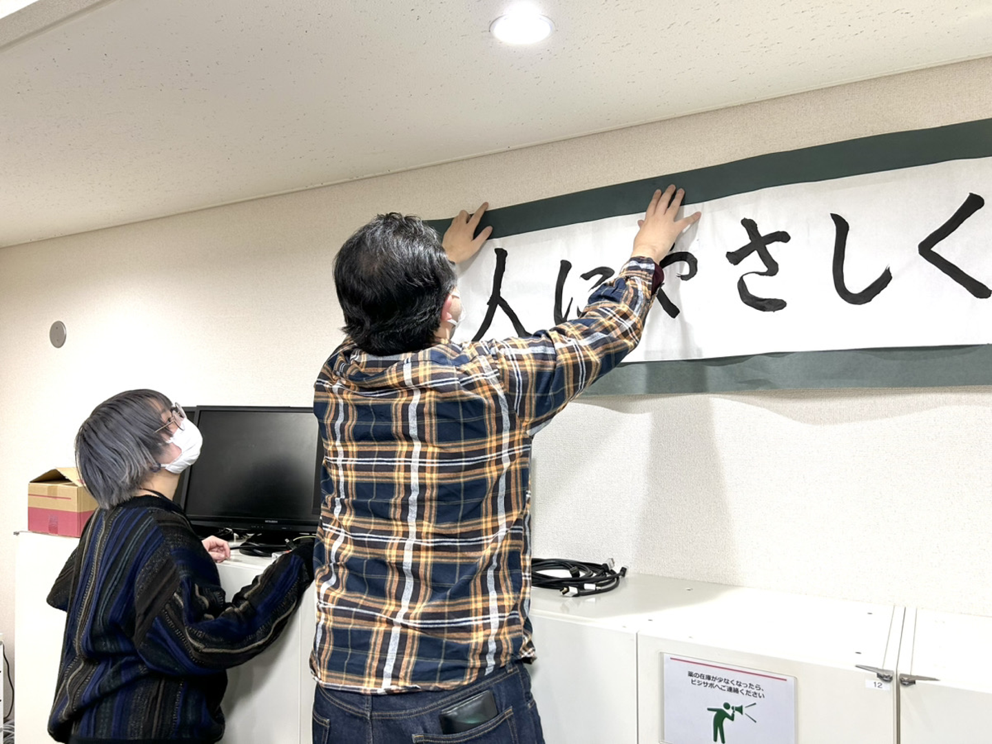 書初めが乾いたら、執務室内に掲示します。背の高いKさんに助けてもらいながら、執務室内の目立つところに掲示することができました。