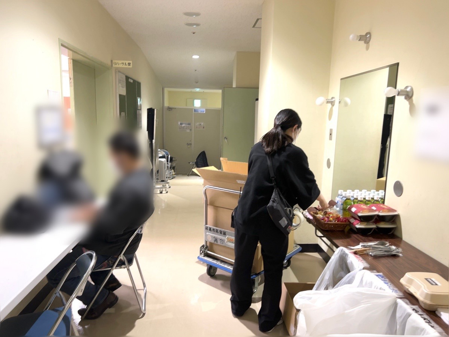 ひととおりの準備が完了したら、待ちに待ったお昼ご飯の時間です!ということで、他のスタッフ達と一緒に楽屋に向かいます。