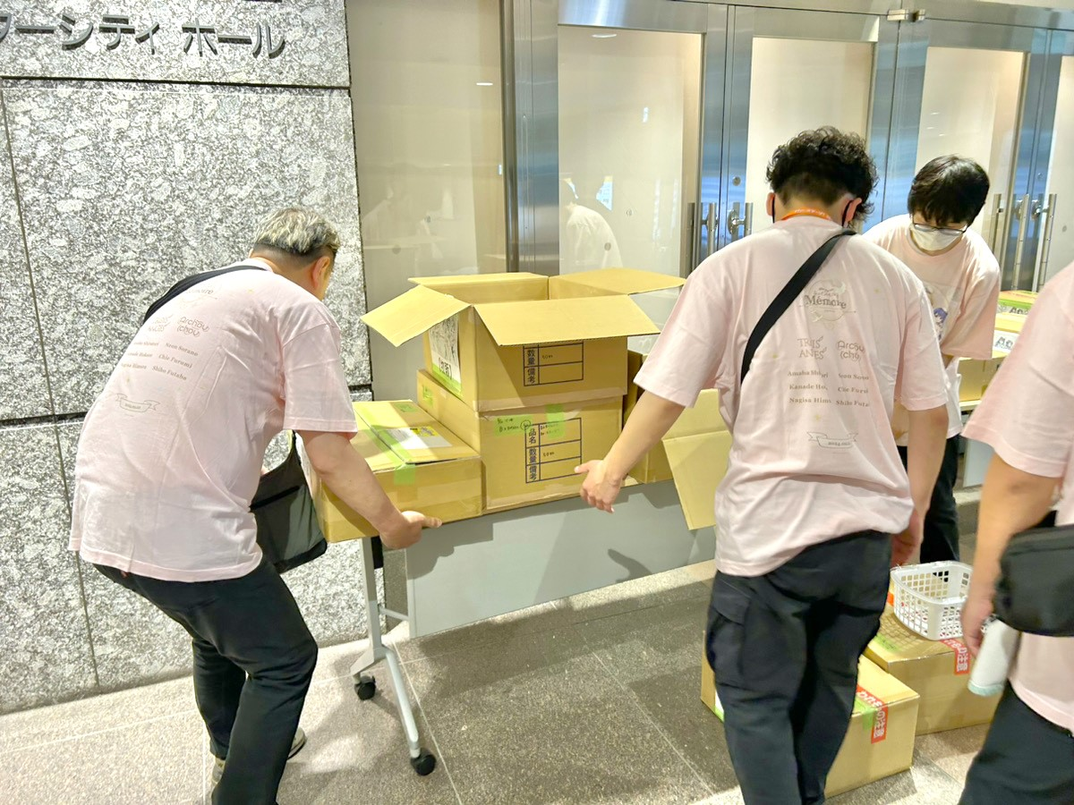 先行物販が終了したら、正面入り口から会場内へ物販ブースを移動させます。今回も手慣れたスタッフばかりだったので、スムーズにブース移動と準備をおこなうことができました。