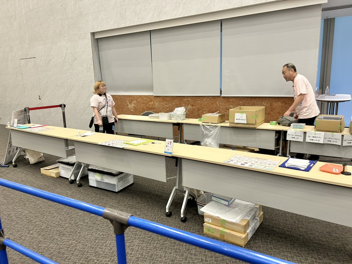 先行物販は、正面入り口の前でおこないます。関口が到着した時には、先に会場入りしていたhotarubiスタッフ達がブース設営を始めようとしていたところでした。