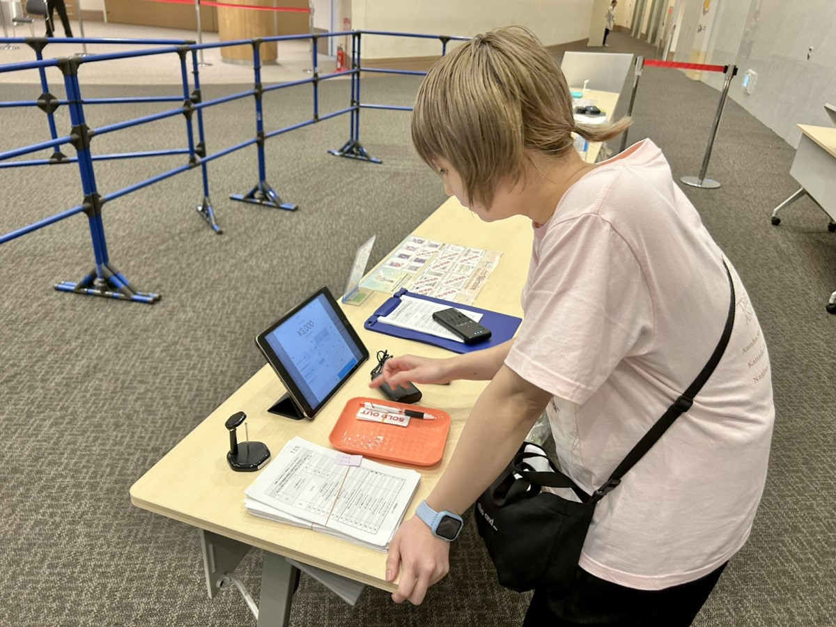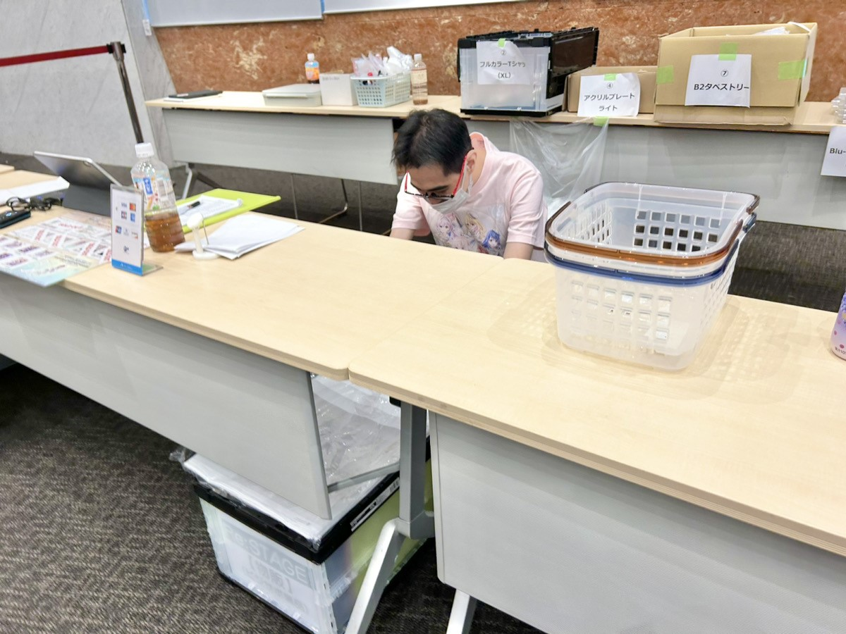 昼休憩が終わったら、2部開場時物販に向けての準備をおこないます。レジやカードリーダーの動作確認、グッズの在庫数も改めて確認しておきます。