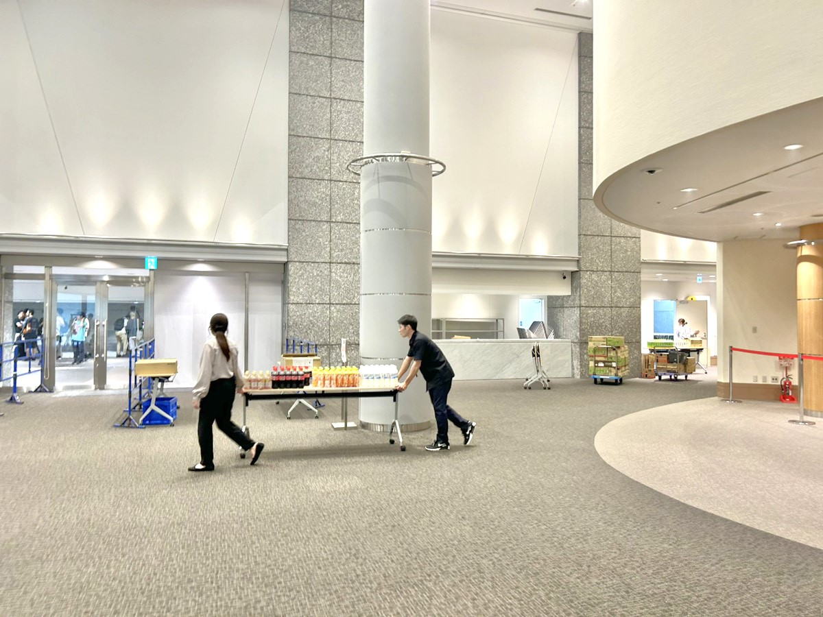 正面入口付近の関係者受付には、受付担当のスタッフ達が準備万端で待機していました。お二人とも、受付担当としてふさわしい笑顔です!