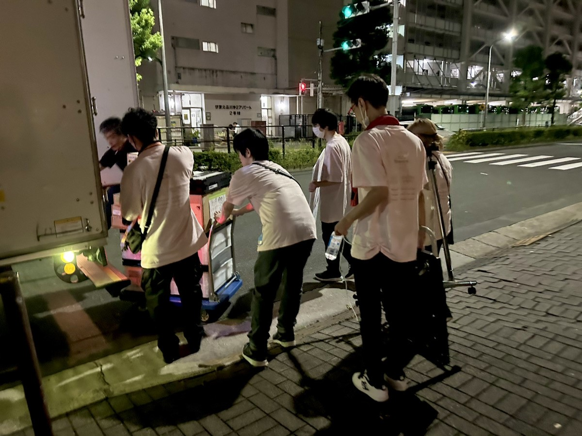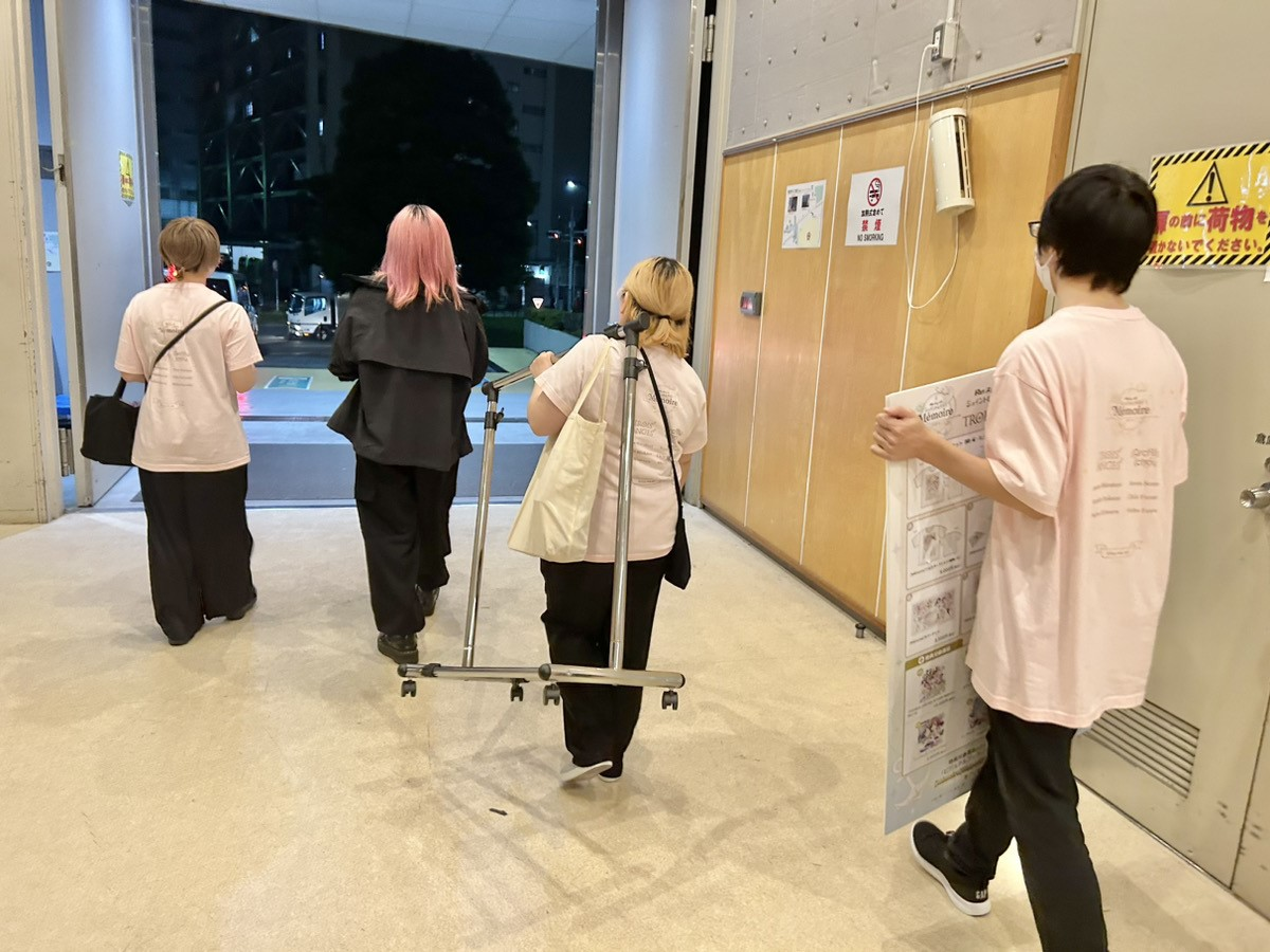舞台袖や楽屋まわりにいたスタッフ達も手伝いに来てくれたので、物販ブースの片付けはあっという間に終了し、まとめた荷物を外で待機しているトラックまで運びます。