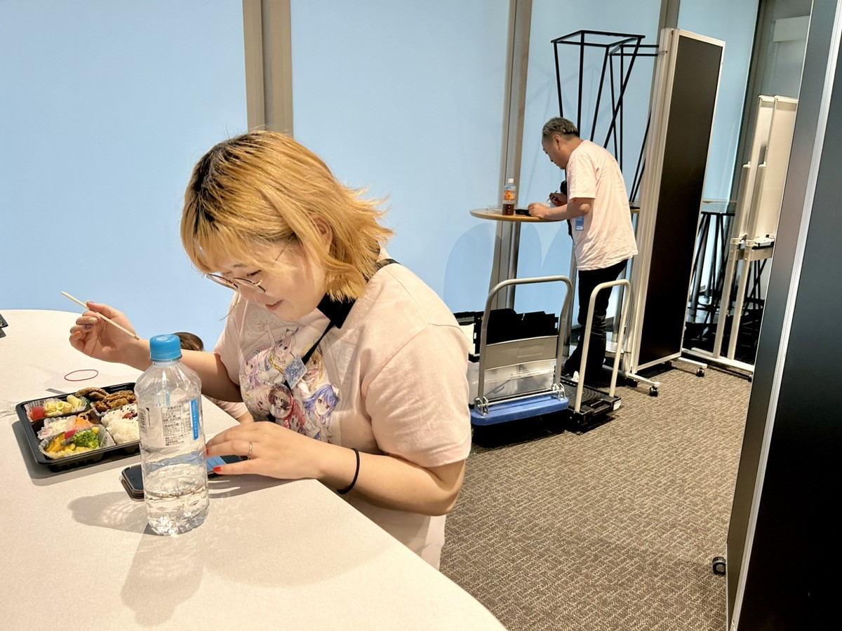 1部開場時物販が終了したら、在庫確認とレジデータの確認、オーダー票の整理などをおこない、お昼休憩に入ります。今回は物販ブースの後ろにスペースがあったので、そちらでお待ちかねの昼食タイムです!
