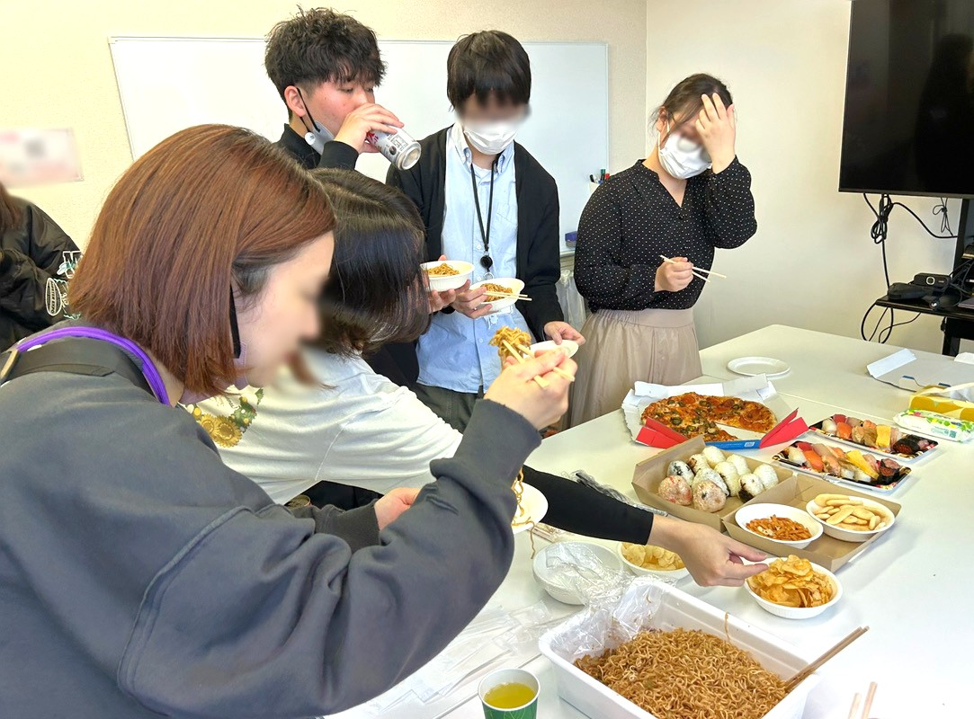超掃除の後は、お待ちかねの納会です。各々好きな飲み物をとったら取締役が乾杯の挨拶をおこない、納会スタートです!