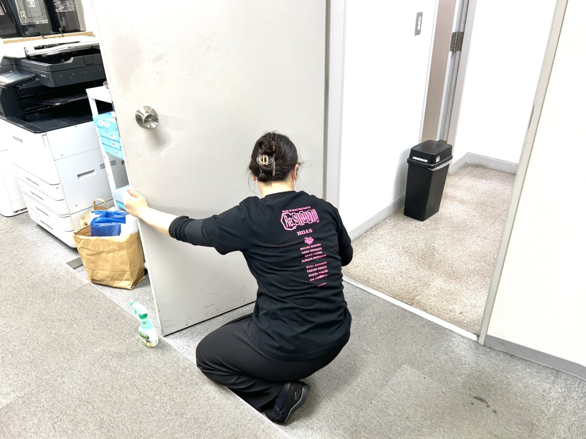 照明やOAタップのコード、壁やフロアマットなど、普段はあまり手が回らないところまで掃除をおこなっていきます。