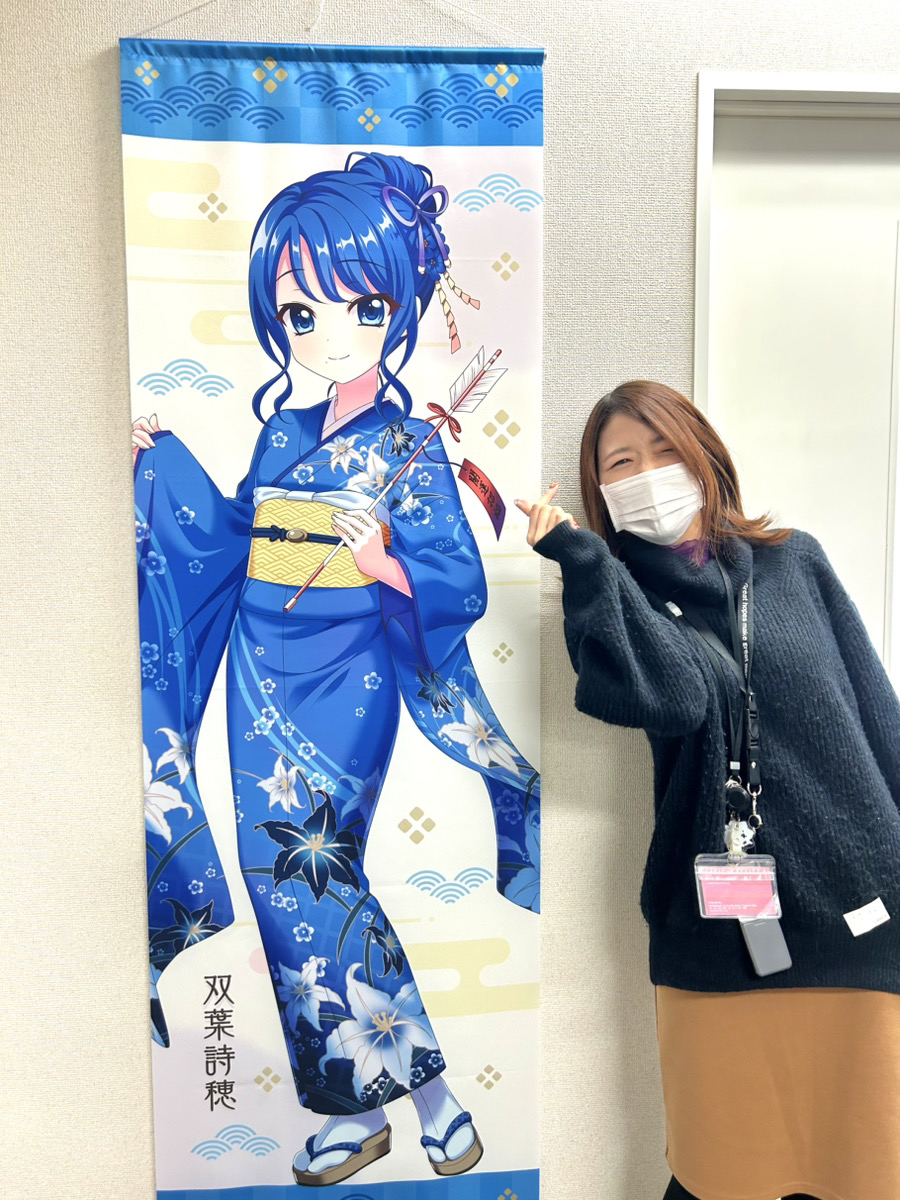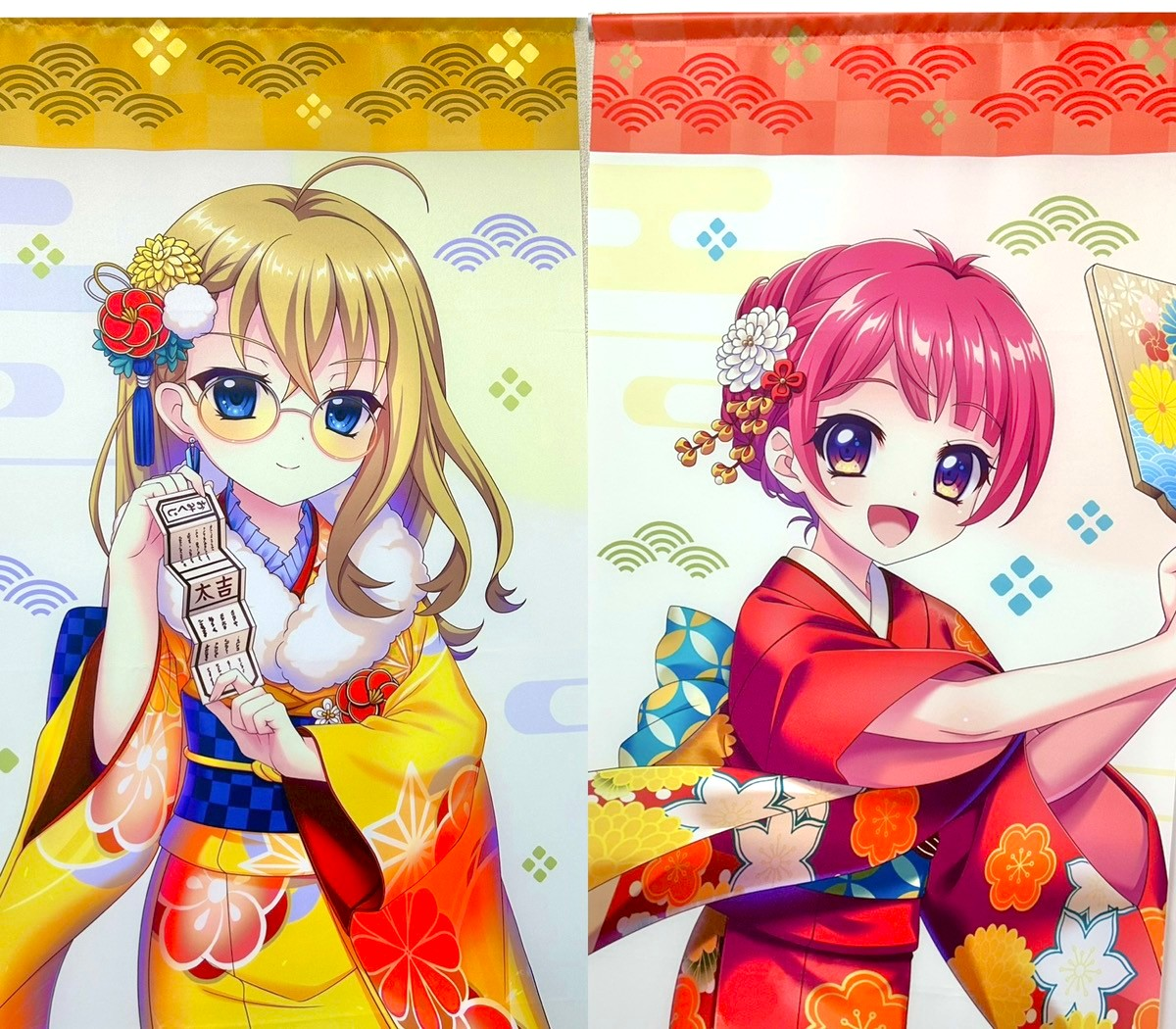 また、執務室内に飾られていた「Re:ステージ!」キャラクターのタペストリーですが、こちらもお正月仕様に変わっていました。アルシュシュの3人の着物姿…とても可愛いです!