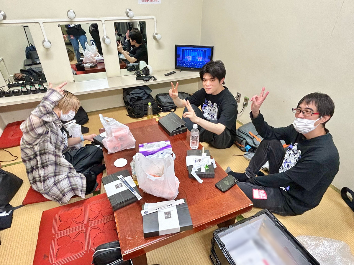 楽屋では、ばくだん焼きのランダムコースターのトレーディングを楽しみつつ、昼食をとりながら、モニター越しに公演の様子を観ていました。