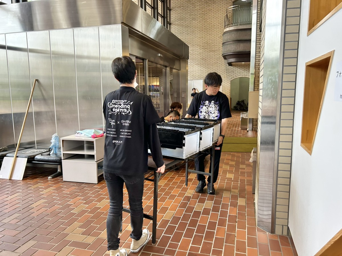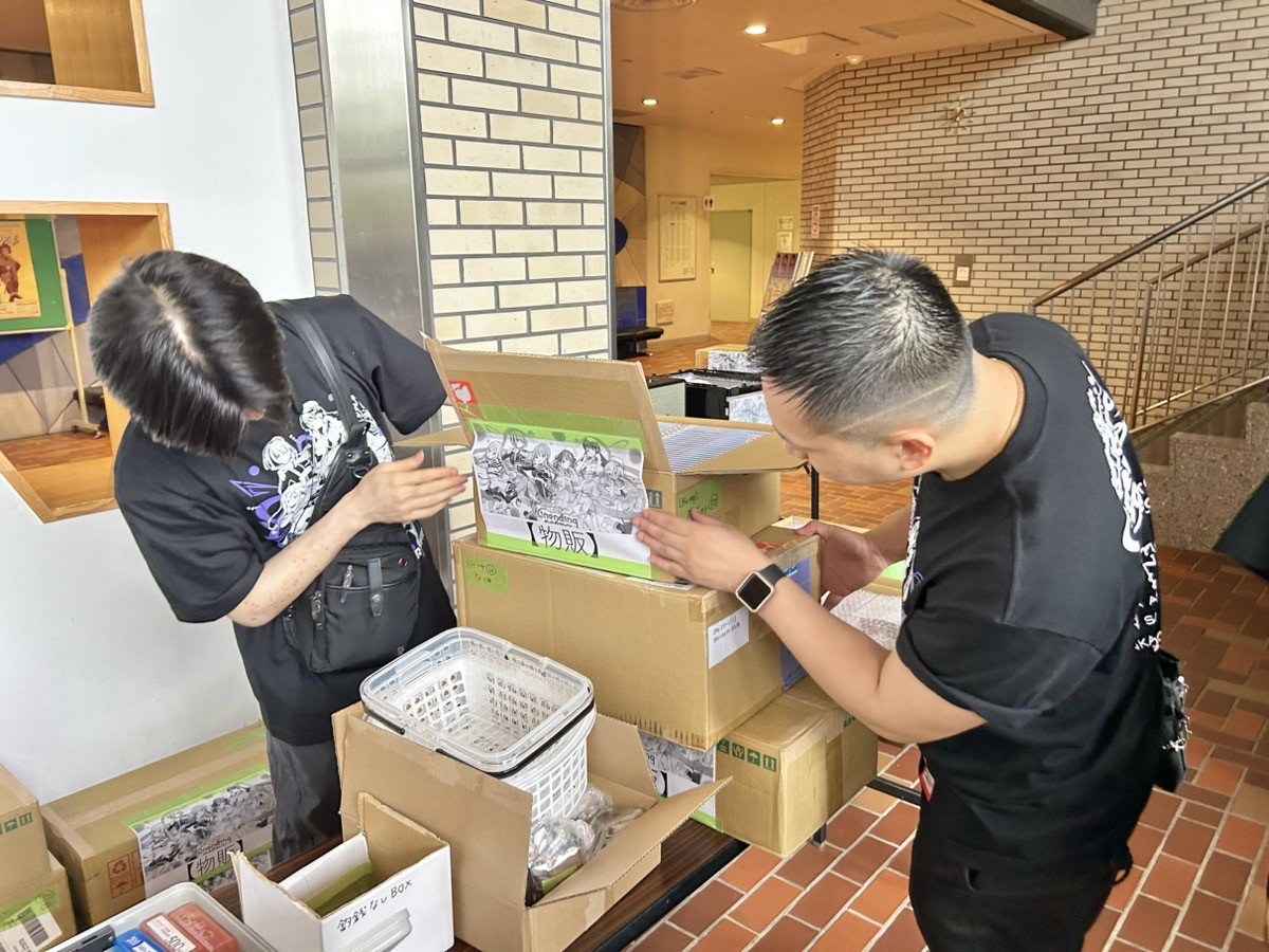 関口が到着した時には、すでに物販ブースの設営が進められているところでした。スタッフ達の手つきも慣れたもので、あっという間に物販ブースが設営されていきます。