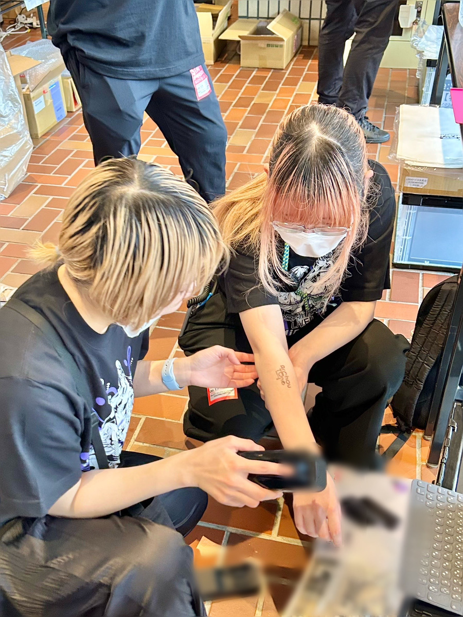 レジ端末の接続も問題ないことを確認したら、今回も専用プリンターを使って、イベントロゴを身体にプリントしていきます。今回は「ArchouTone」のロゴデザインが、スタッフからは人気でした!