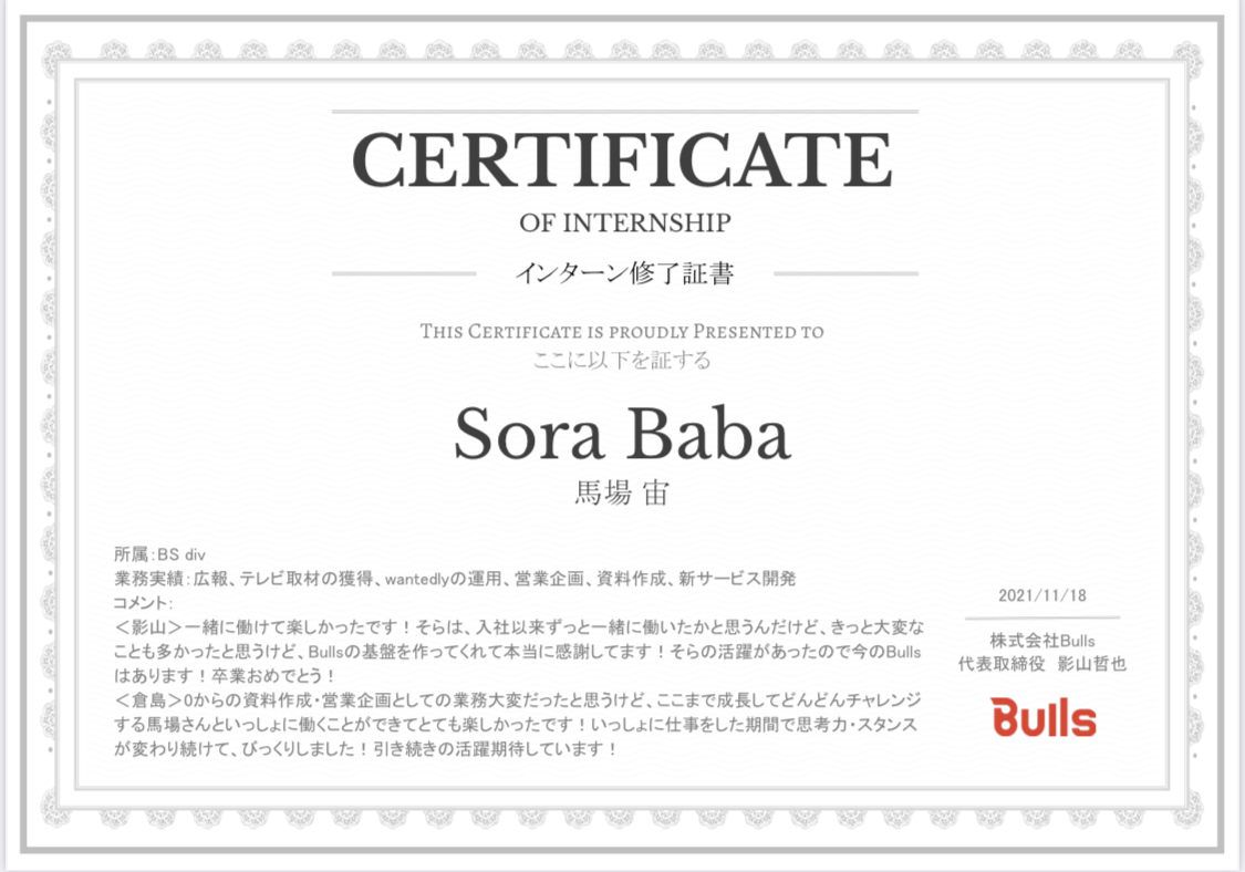 4月から大手の広告代理店へ就職が決まっているのですが、その環境でもBullsの成長率に負けないくらいに、また大きな力となれるように、失敗を恐れず目標に食らいついていきたいと思っています!