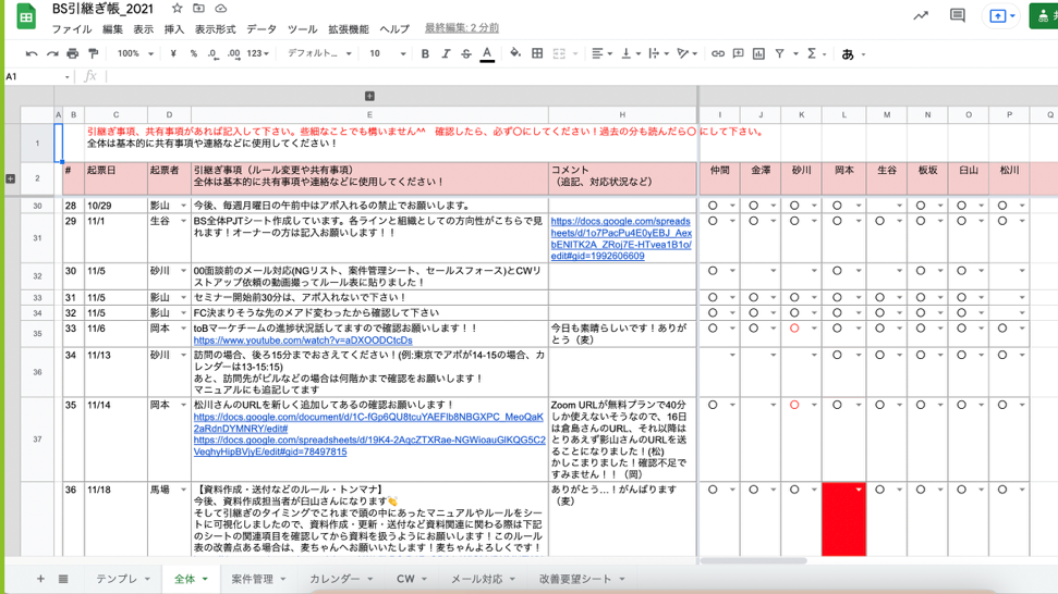 業務改善のために作成した引継ぎ標(スプレットシート上で誰もが確認できる仕組みづくりを行った)