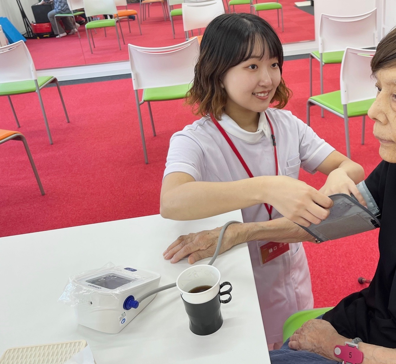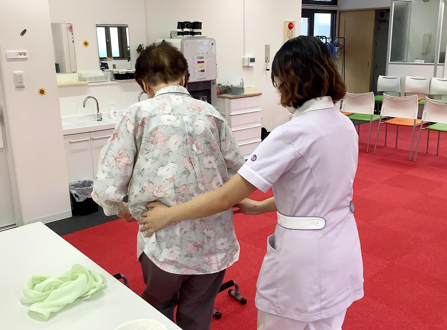 ご利用者様のお荷物をお預かりし、洗面所で手洗いうがいの誘導。水分補給をしていただいている間に、血圧と体温を測定し、体調の確認を行います。