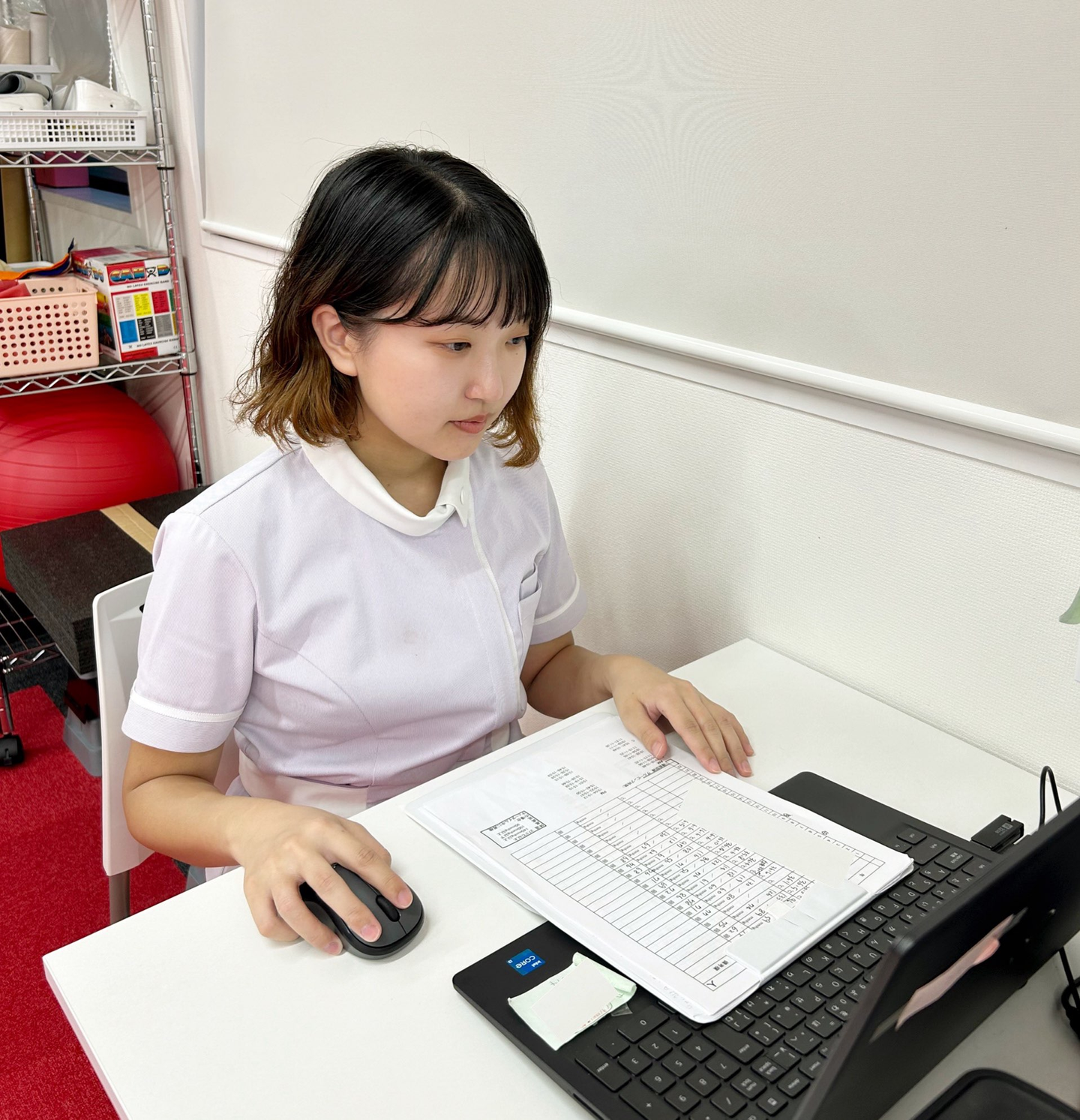 ナース服に着替えた後、名札やコップの準備など受け入れ準備をしつつ、電話対応を行います。