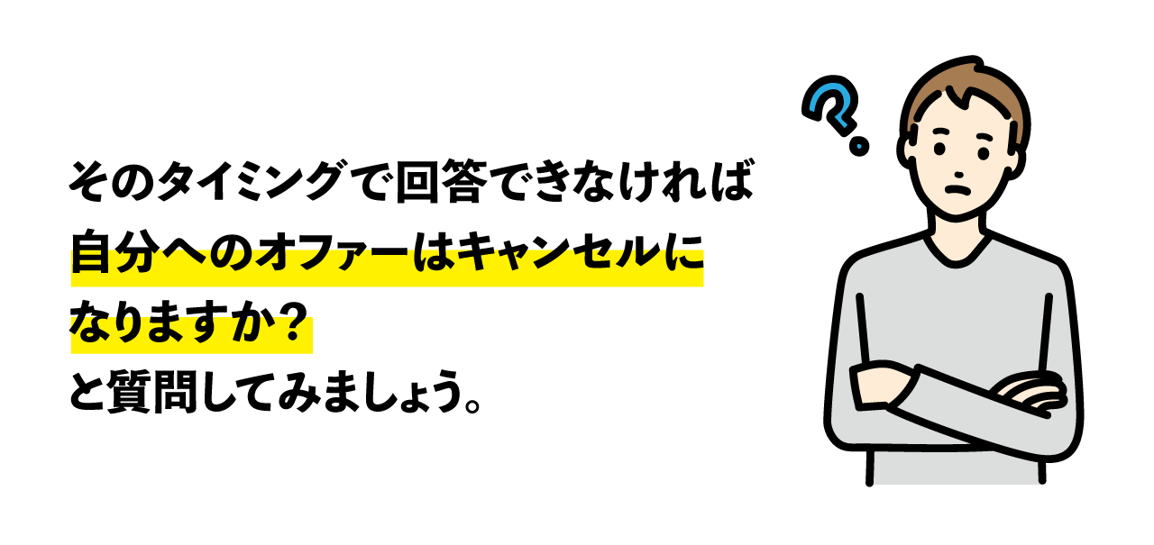 仮に、今日受けた面談でオファーが出たという場合、よくあるケースなのですが、複数面談が控えている状態でこういったセリフを聞いたことがあると思います。