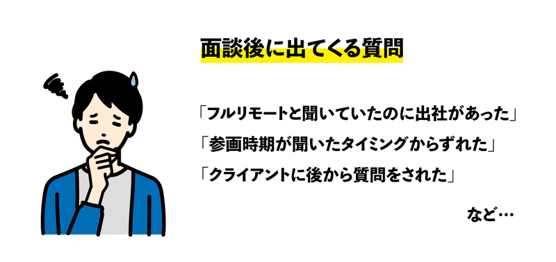 面談はエンジニアとクライアントの希望条件がカップリングするかを見極める場と言えます。そのため、面談後の質問や後出しで出てくる情報といったものはない方がベターです。しかし、どうしても発生してしまうケースもあります。例を挙げると
