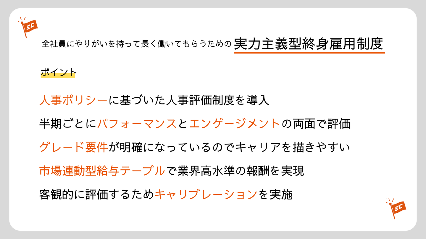 これらの制度を考える際に大事にしたのが「実力主義型終身雇用制度」という考え方です。全社員にやりがいを持って長く活躍してもらうための人事評価制度を設けています。