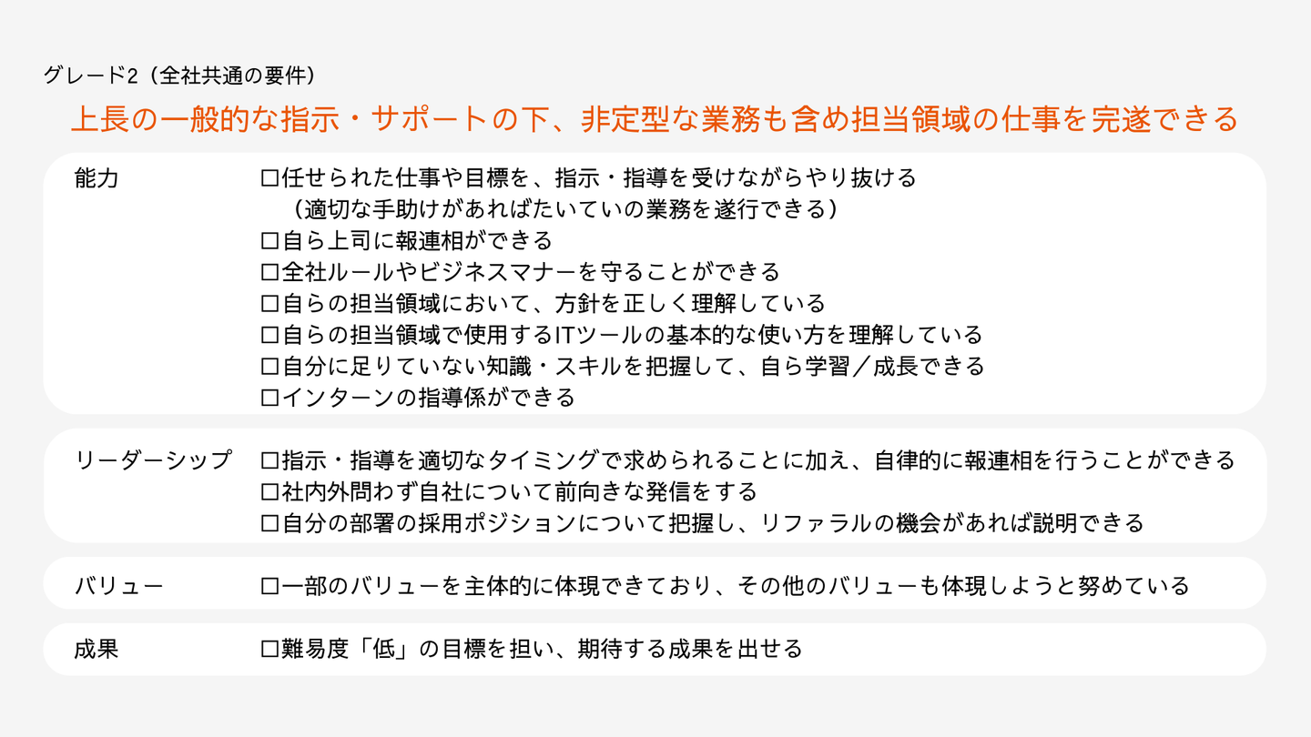 この図は、部署を問わず全員に適用される、グレード2の全社共通の要件です。このように、各グレードの要件がチェックリストのようになっているので、自分がいま何をすべきかが明確になっていますよね。
