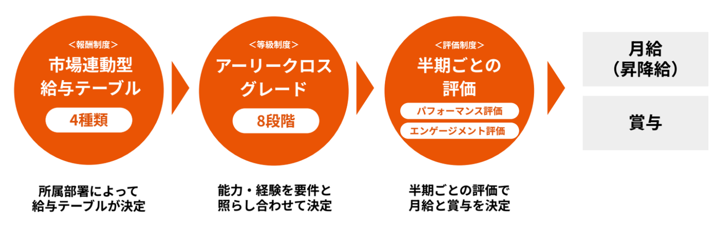 まず、自身が所属する部署に応じた給与テーブルが適用されます。次に、等級制度は8段階となっており、能力・経験を各グレードの要件に照らし合わせて自身の等級が決まります。そのうえで、半期ごとにおこなわれるパフォーマンス評価とエンゲージメント評価によって、給与(昇降給)と賞与が決められる仕組みとなっています。