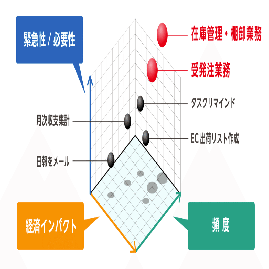 下記の図でもわかる通り、3つの因子がすべて高い業務になり自動化できると絶大な効果を実現できる業務です。