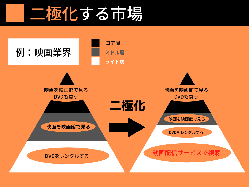 動画配信サービスがレンタルよりも映像の質や借りる手間など、金額以外の面でもローコストを実現したことで、3階層目が厚くなり、ミドル層を取り込んでいます。